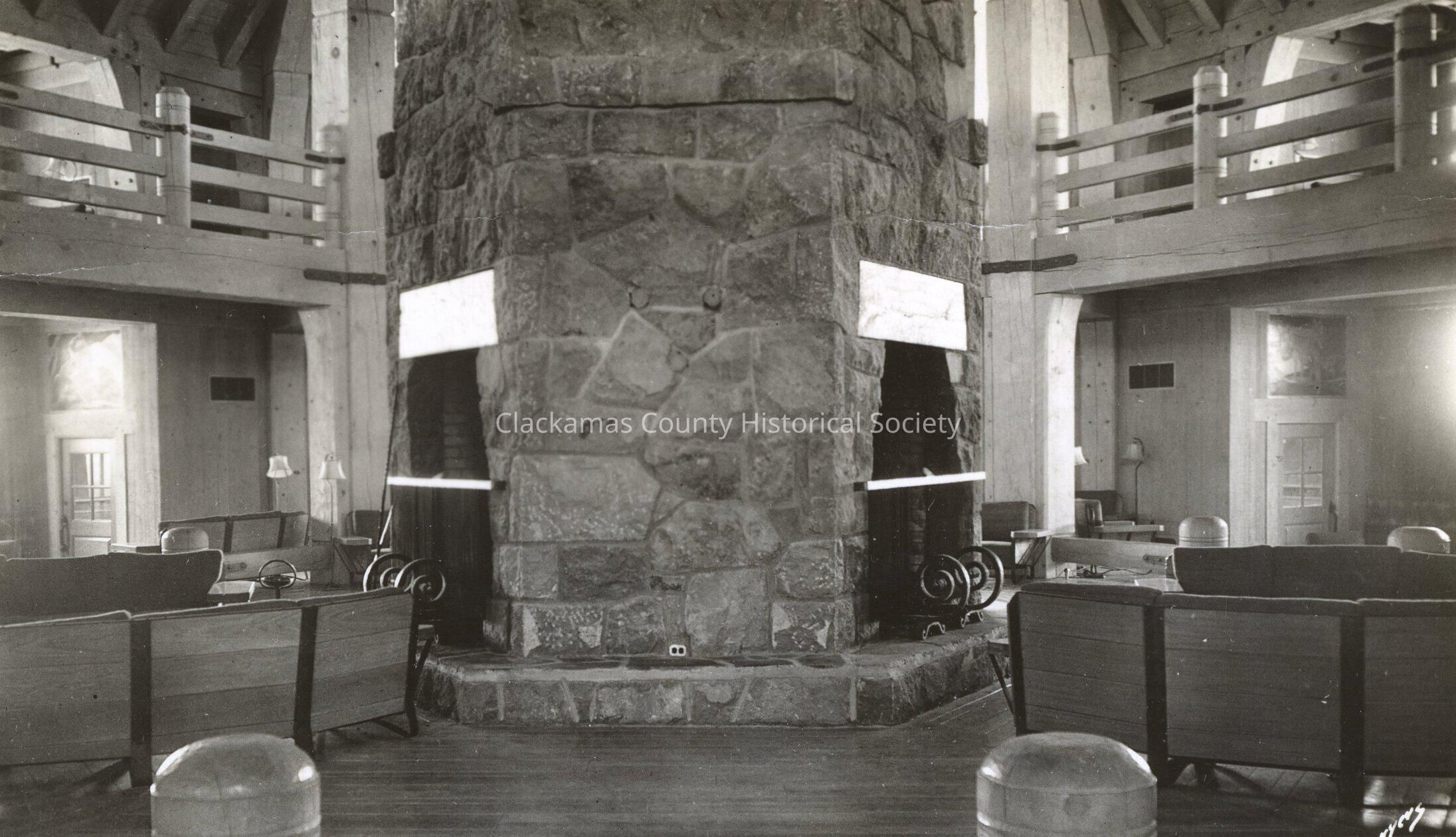 Timberline Lodge, interior featuring main lounge and fireplace