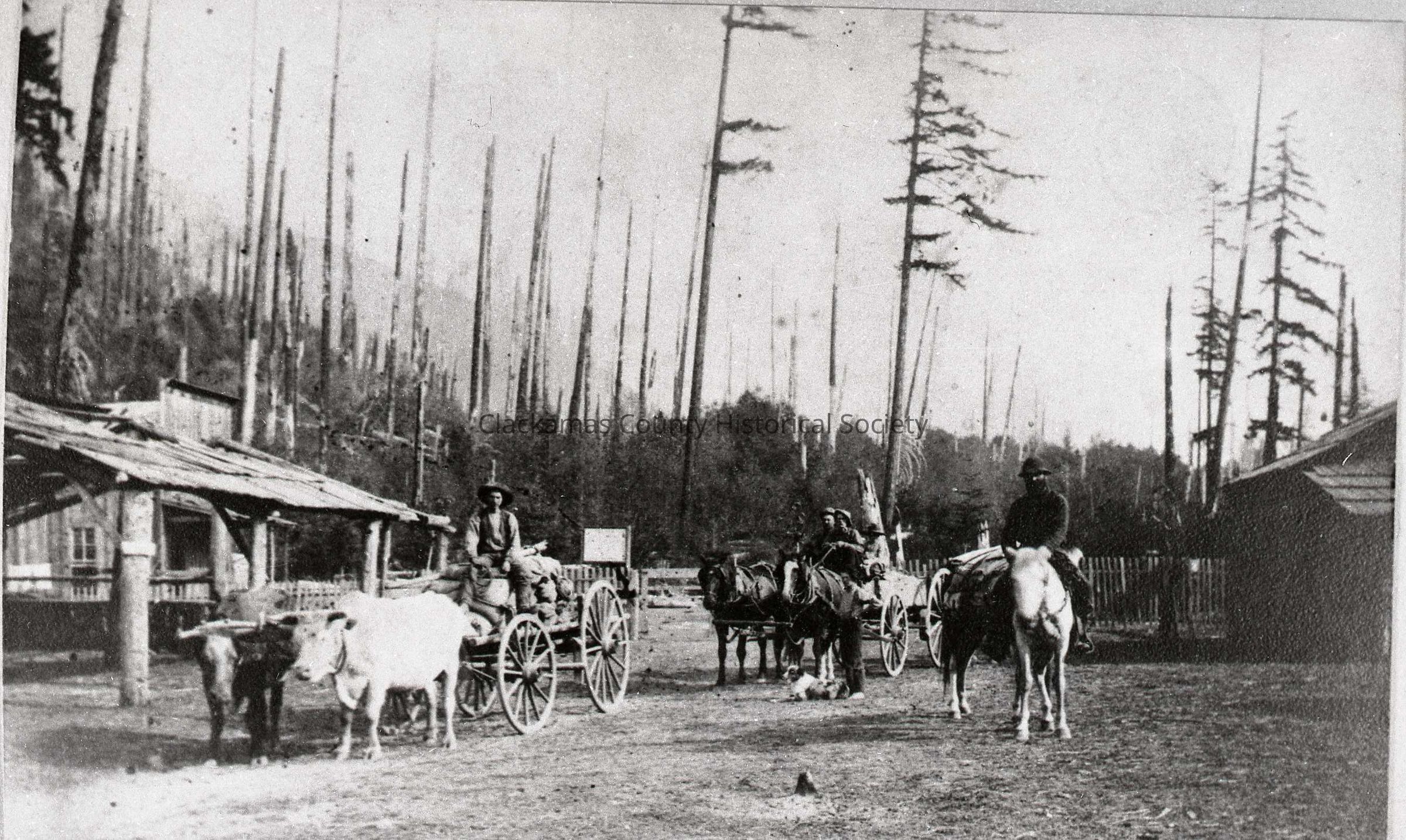 Toll Gate near Rhododendron and Mt. Hood. Ernest Sievers with Ox Team; Sheepherder on Horse; Sam and Sarah Bacon with Adam Kotyman on Horse Wagon. 1872