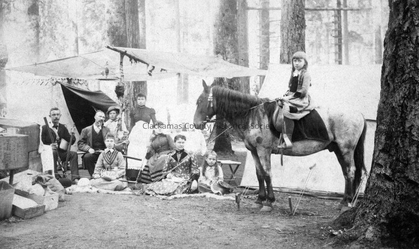 Chautauqua(?). Tom Randall Campout. Family with tent in forest. Girl on horse. Maybe Gladstone area?Made/Created