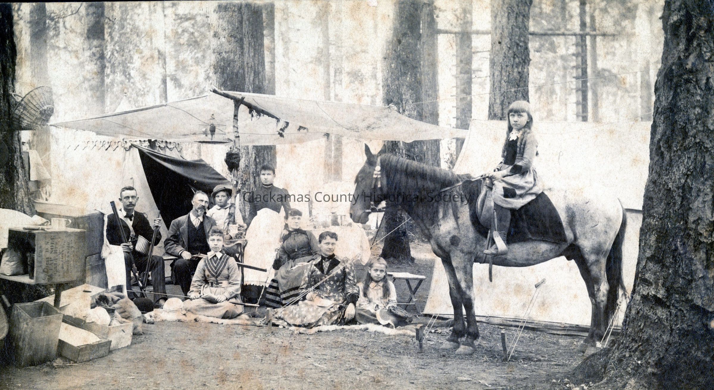 Photograph of Tom Randall and family camping. Possibly at Chautauqua. Shows tents, cooking utensils, and 9 family members. One member is a young girl sitting on a horse.