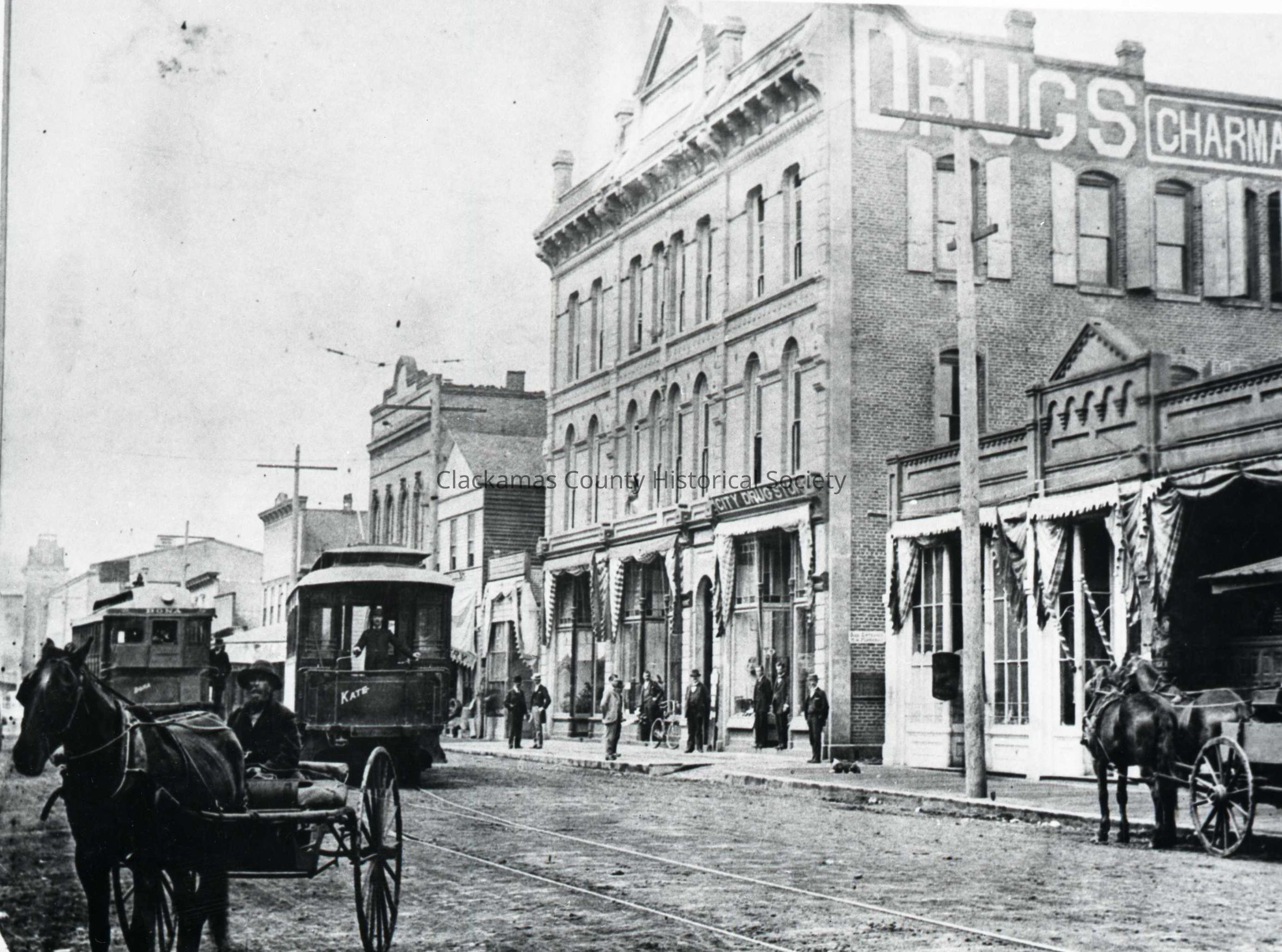 Trolley Cars "Kate" and "Dona" at 4th and Main, in front of the Electric Hotel c. 1895 Oregon City.Made/Created