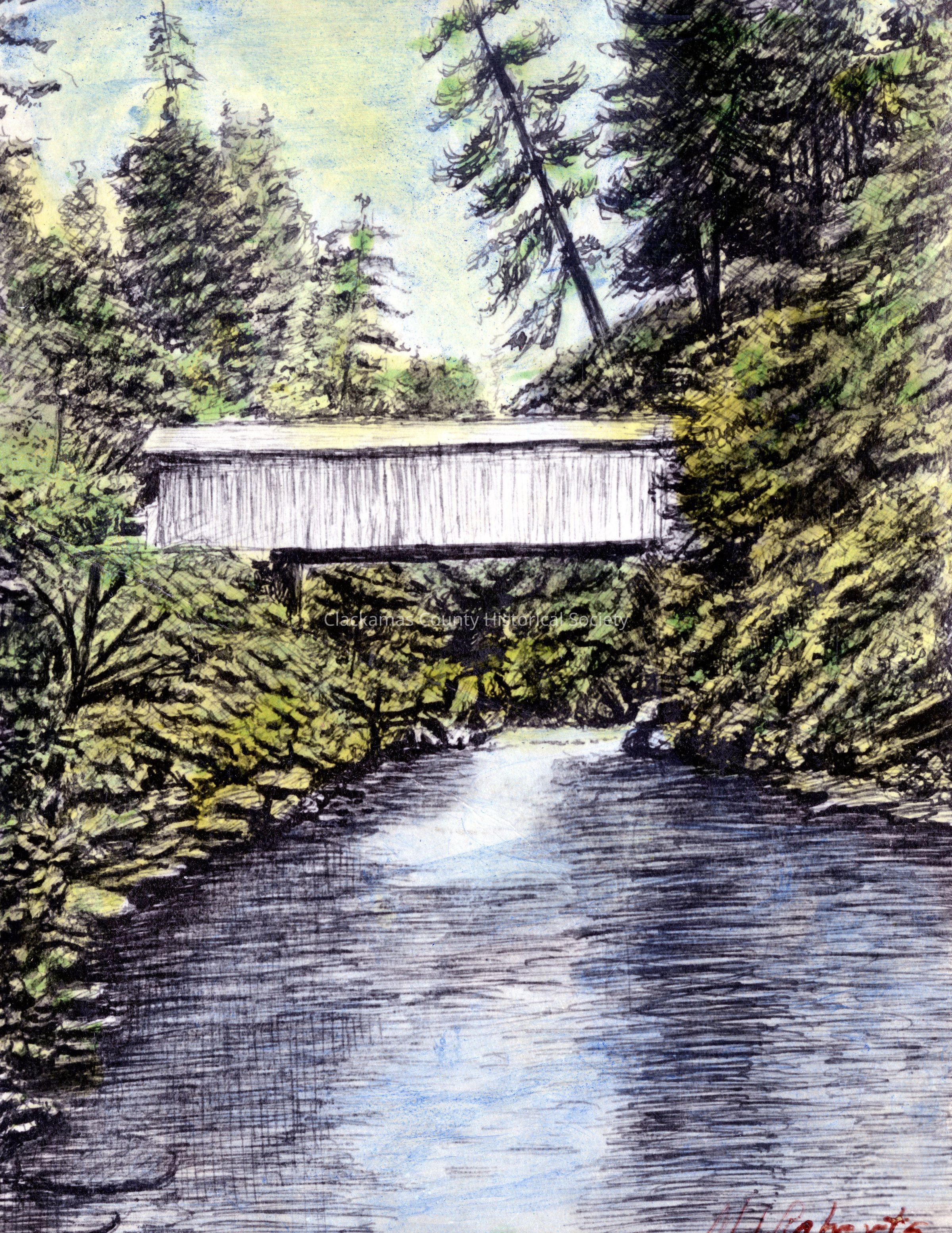 Trout Creek Bridge. Last of the Clackamas County Covered Bridges. Colored Drawing of photograph at B-0125.001936a.Made/Created