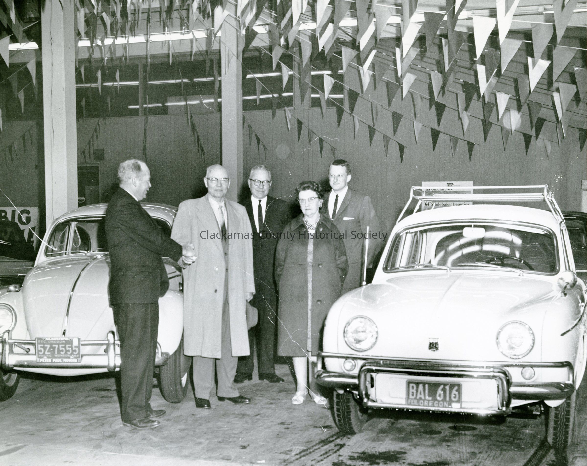 Two Men Shaking Hands with 1 woman and 2 men watching. The photo is possibly taken at a Volkswagen car dealership.Made/Created