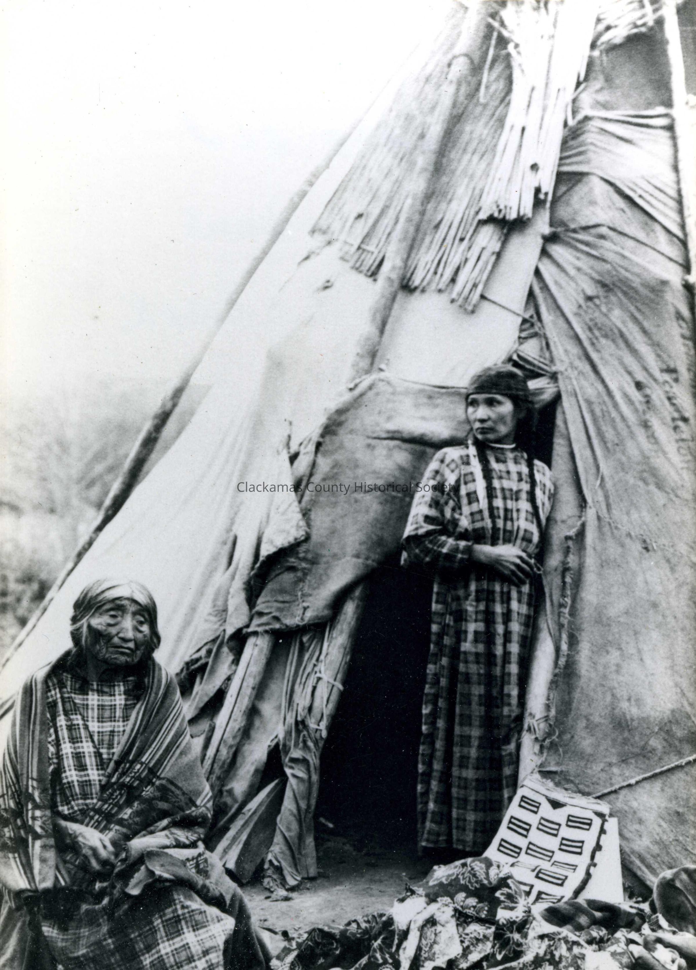 Two Native American Women in front of Tipi. The notation on back of photo reads: "The older woman is 111 years old and she remembers Lewis and Clark." The name Dan Thompson is also listed.Made/Created