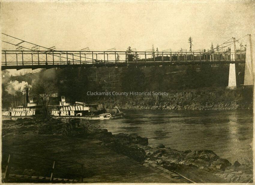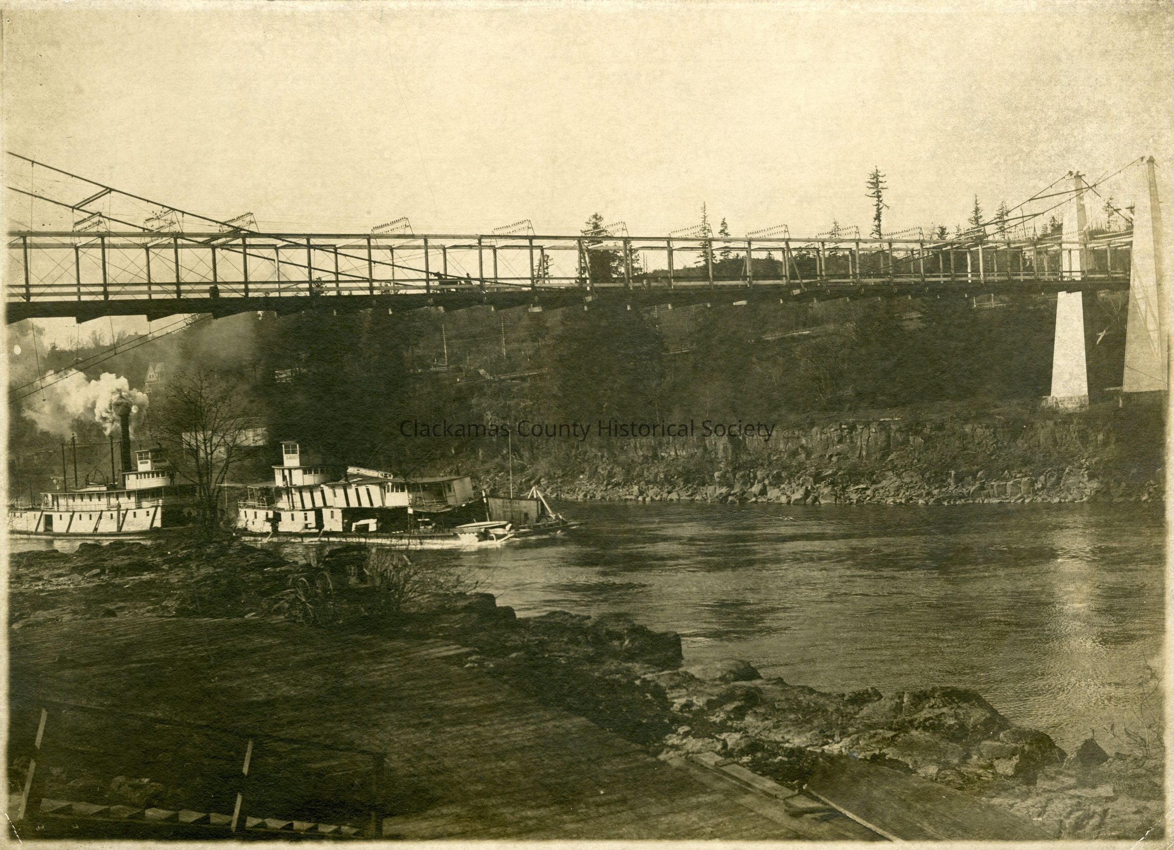 Two Steamboats Under Suspension Bridge in Oregon City.Entry/Object ID