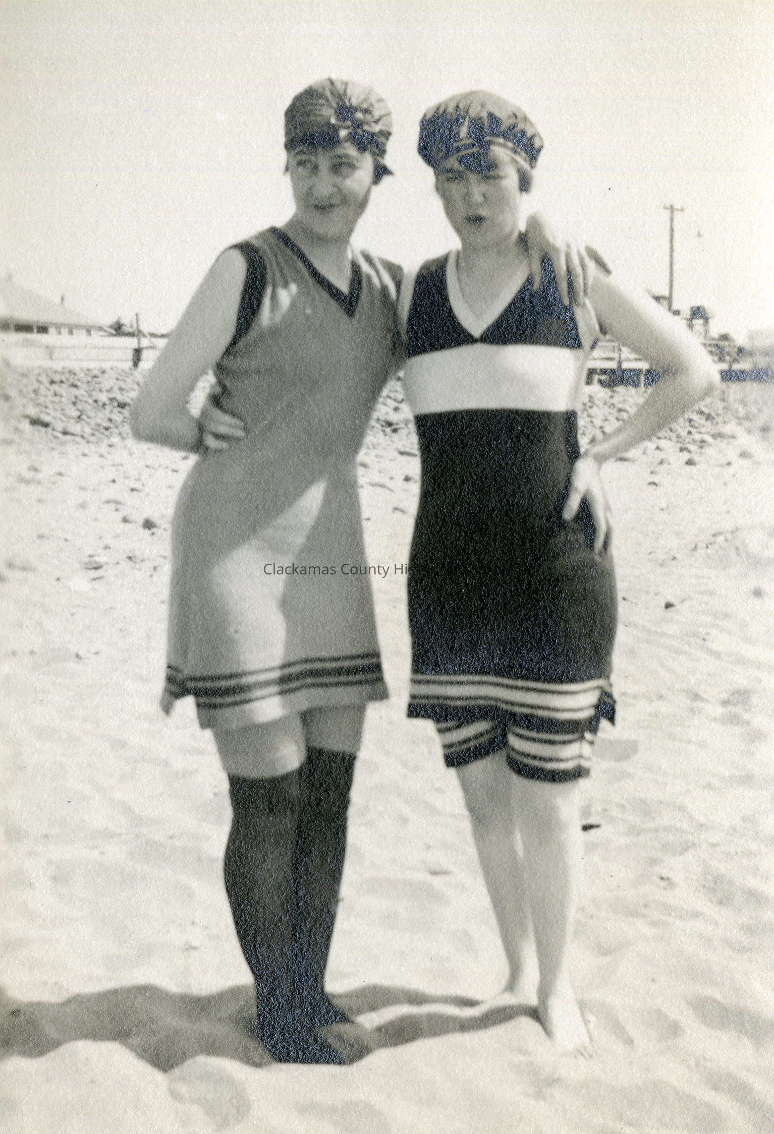 Two Unidentified Women Standing on Sandy Beach in Swimsuits. Date and Location Unknown
