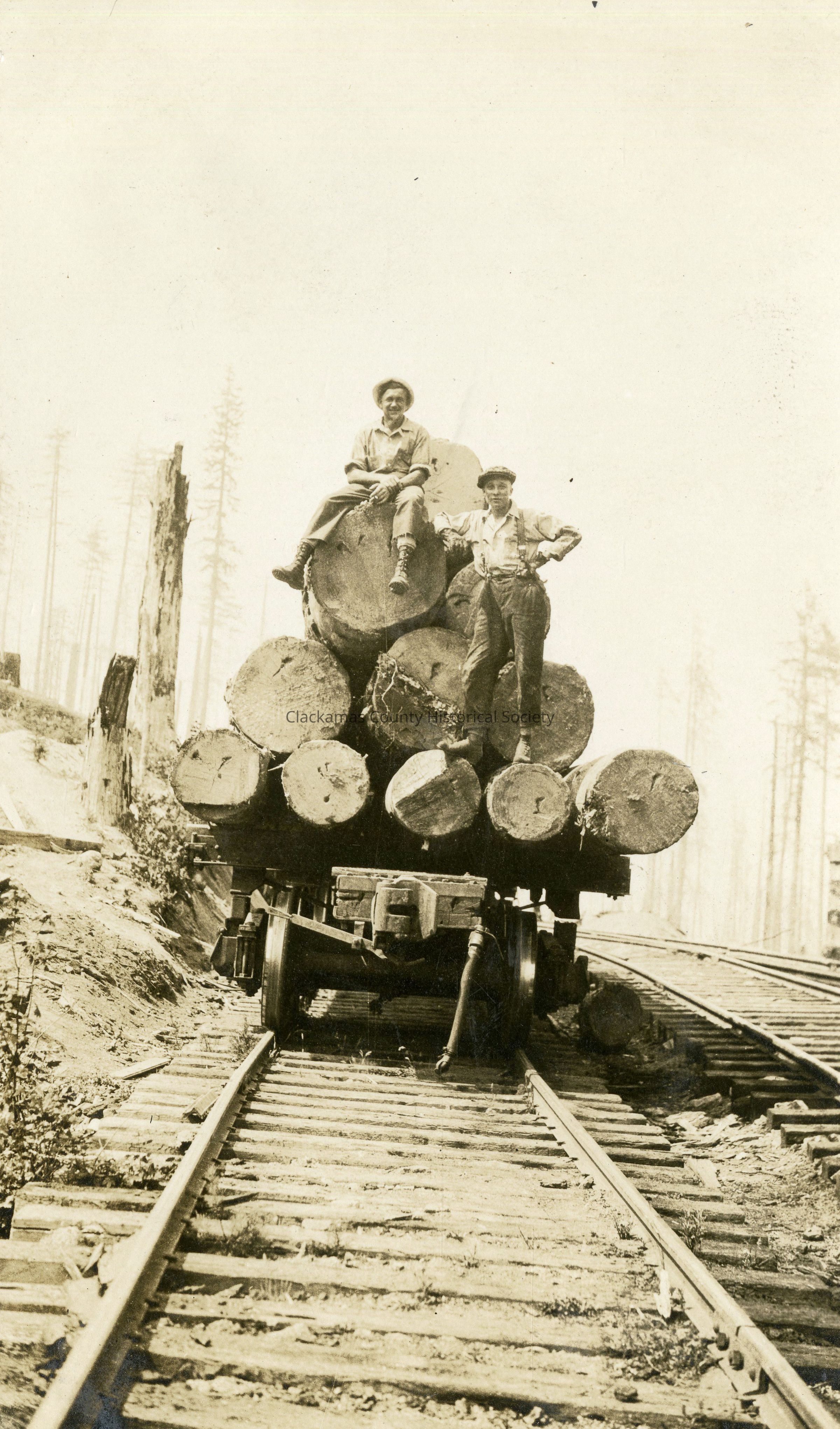 Post Card of Two Unknown Men on Railroad Car with Logs