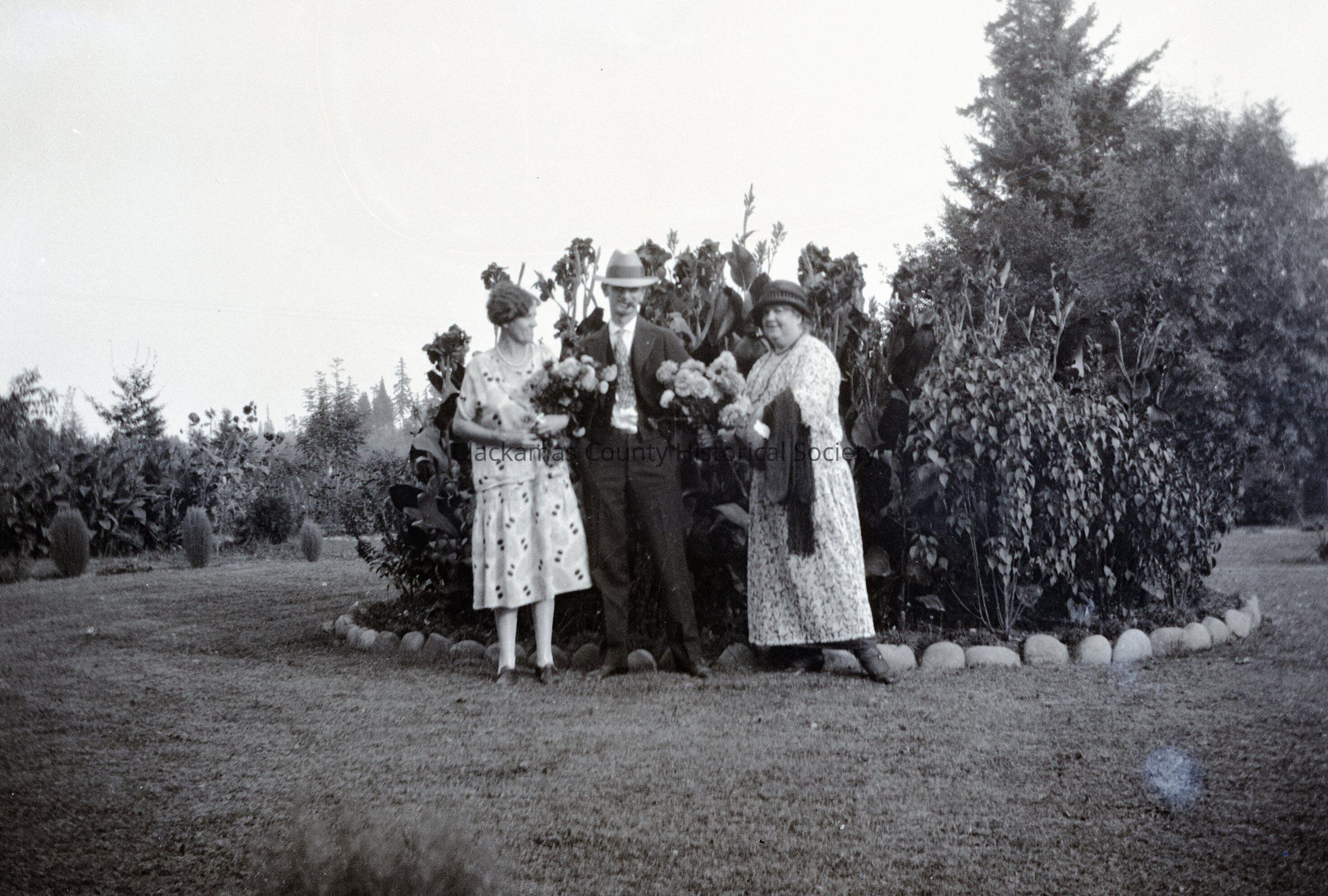 Two Women and a Man Holding Flowers.Entry/Object ID
