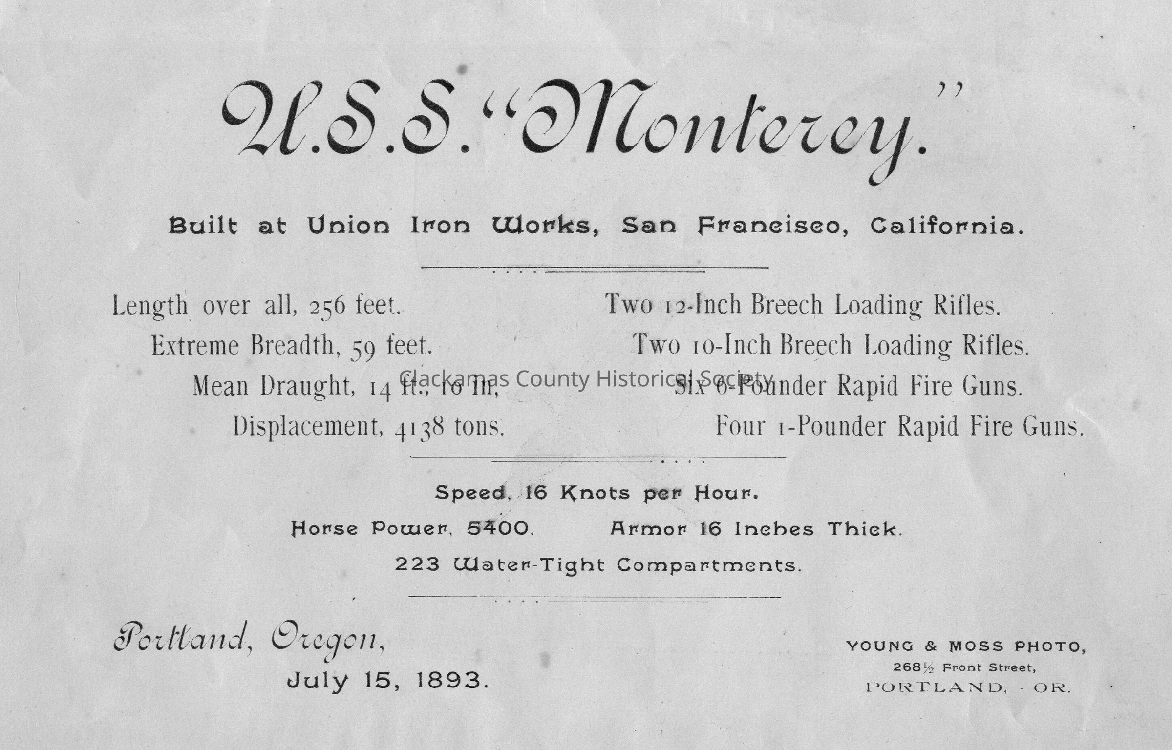 U. S. S. Monterey, 1893. Battleship. Ship was in Portland. Photo and an explanation sheet.Made/Created