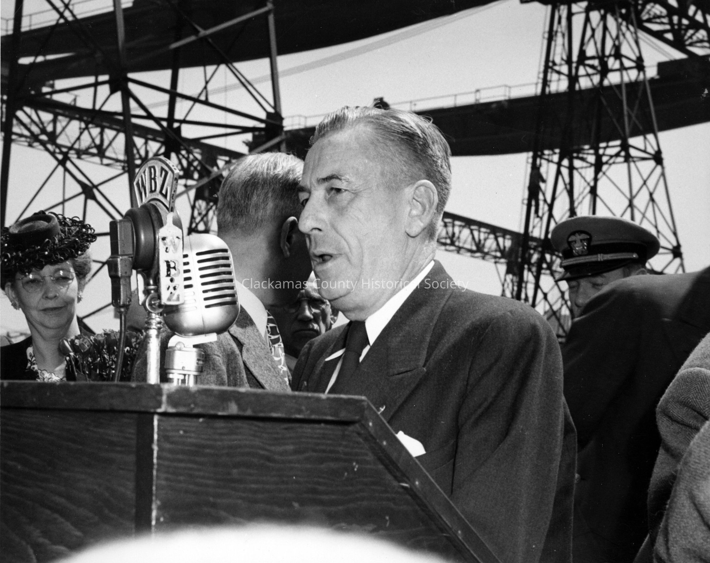 U.S.S. Oregon City, 1945. Launching of ship. June 9, 1945, Quincy, MA. U. S. Representative Mott and Mrs. Ruth Caufield.