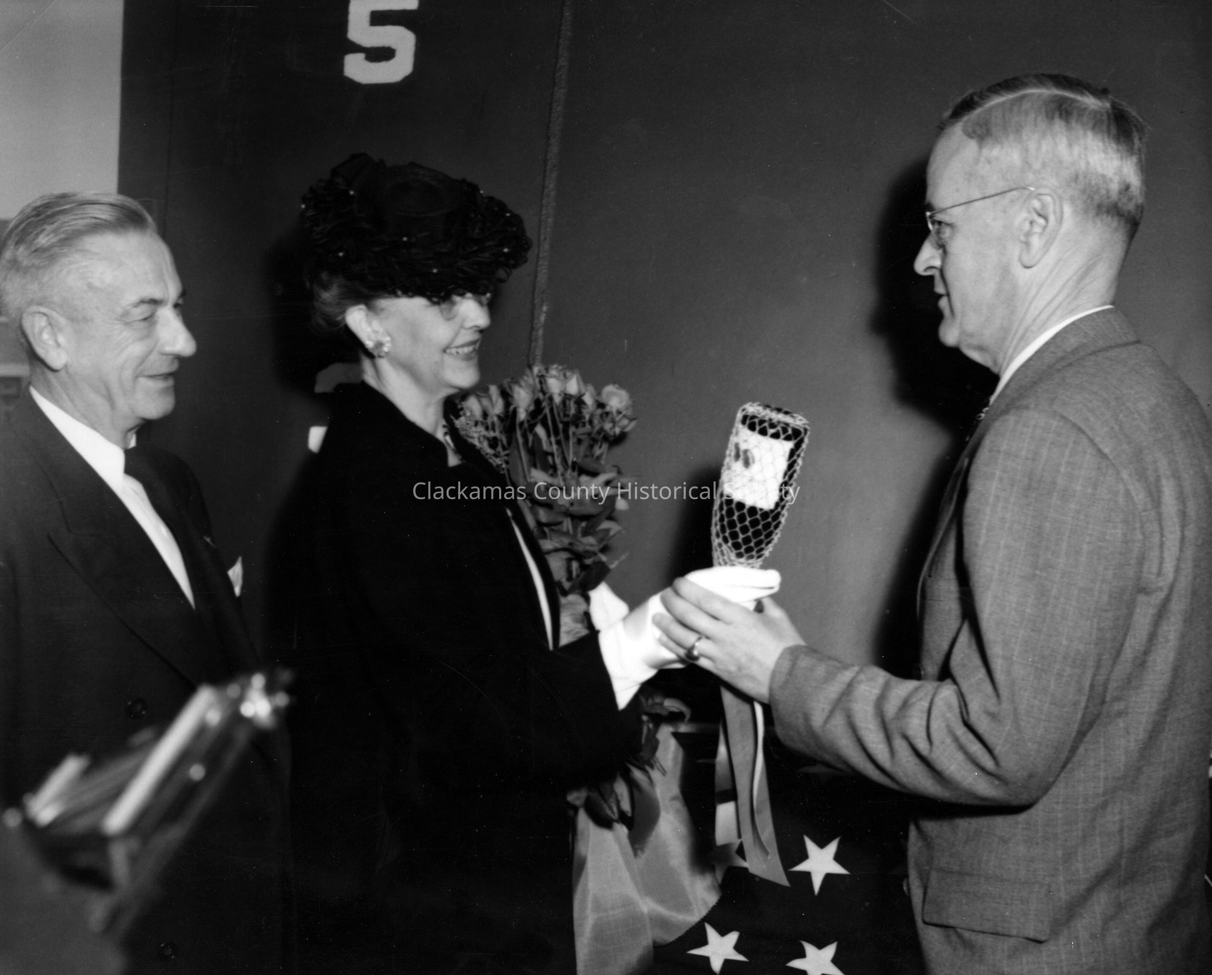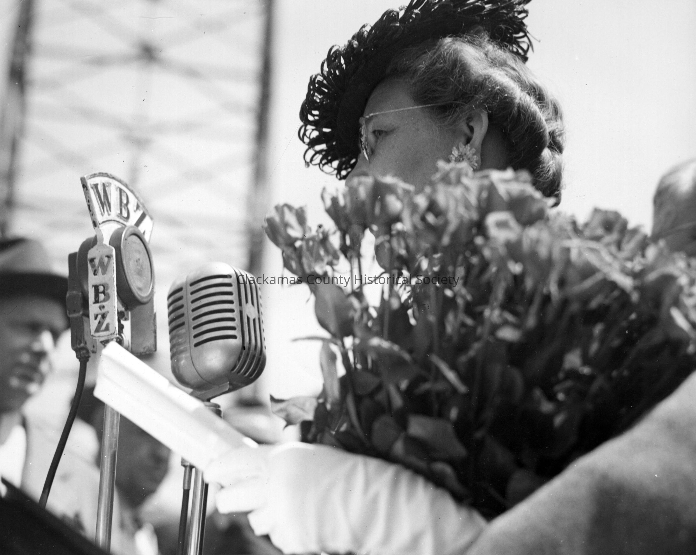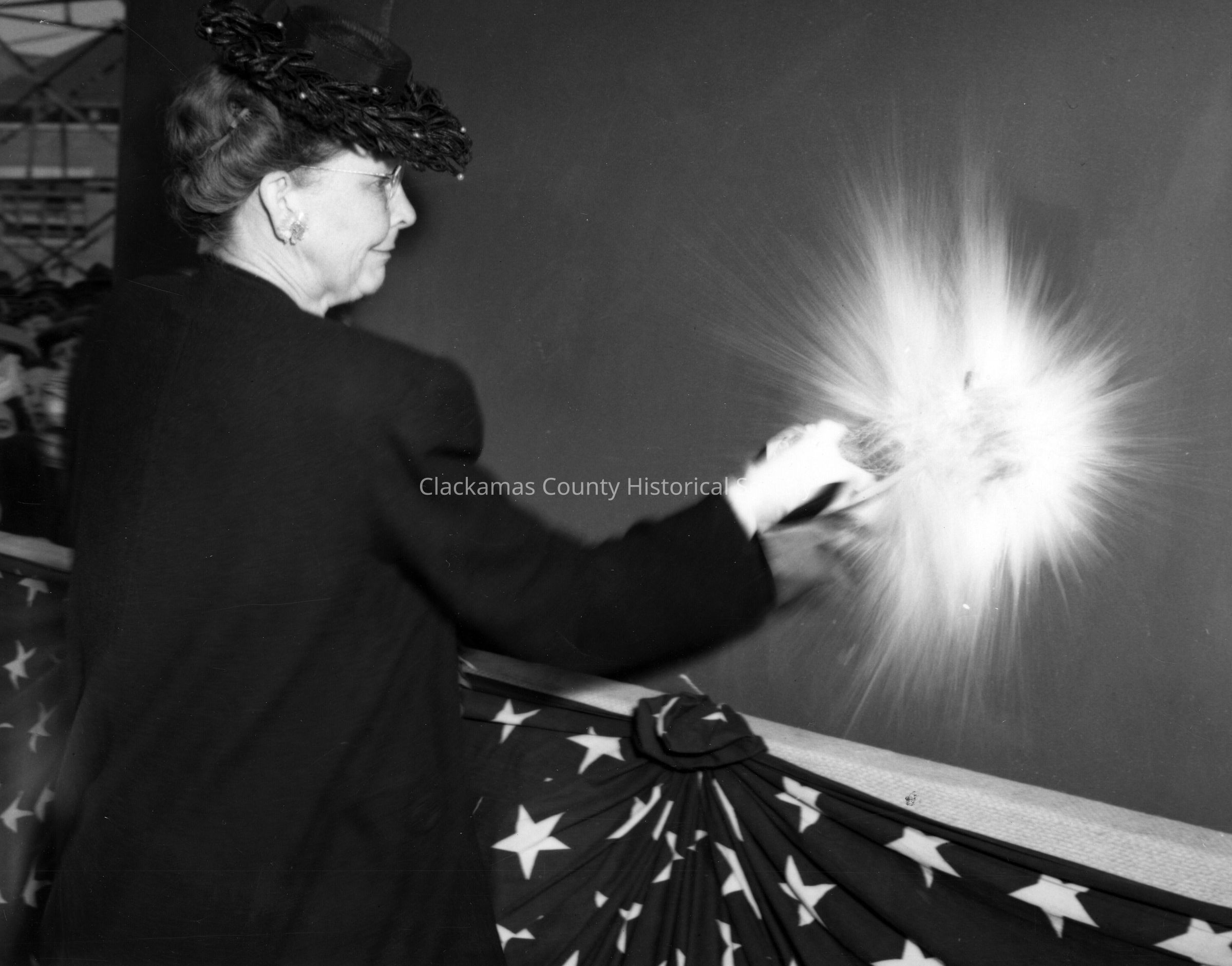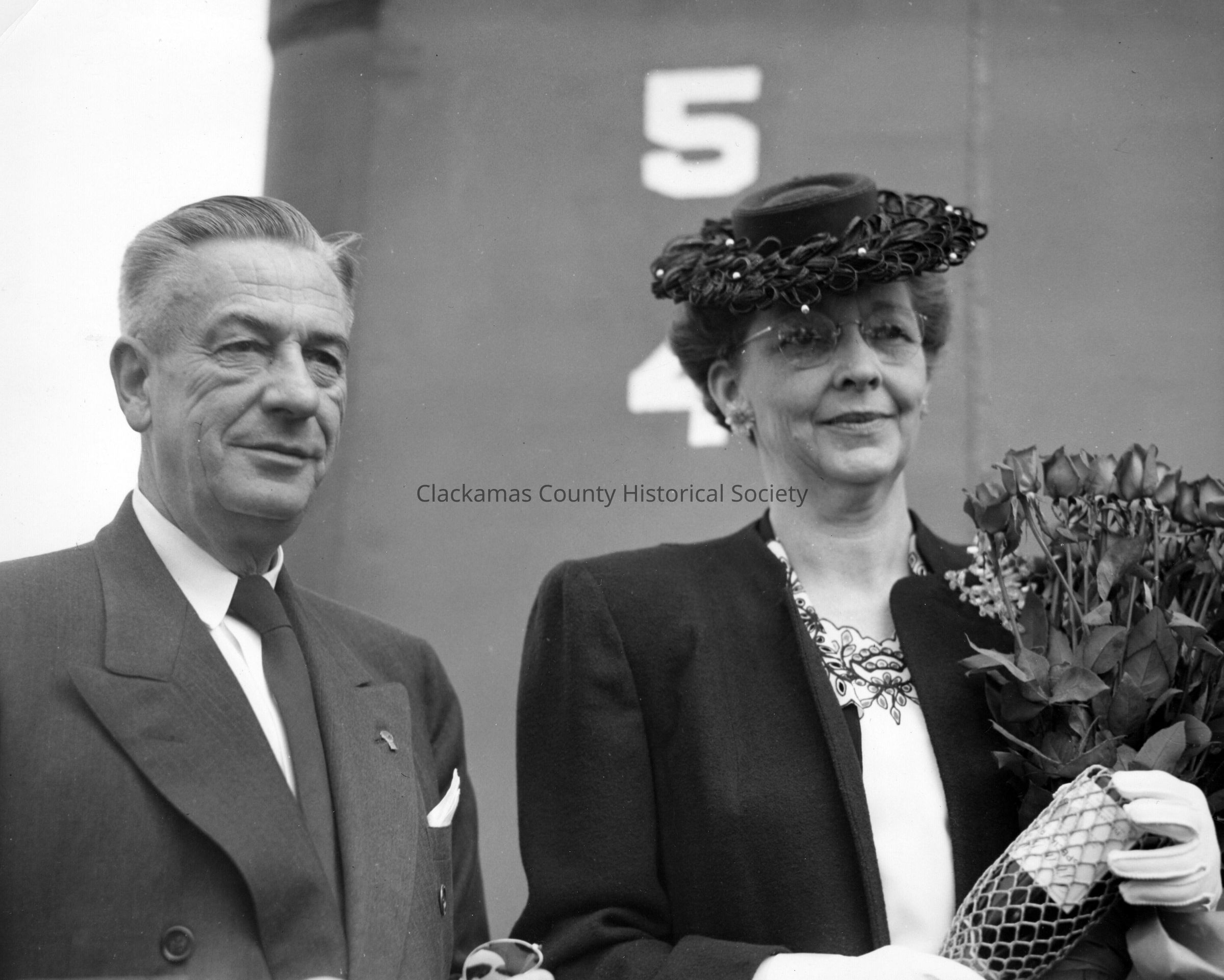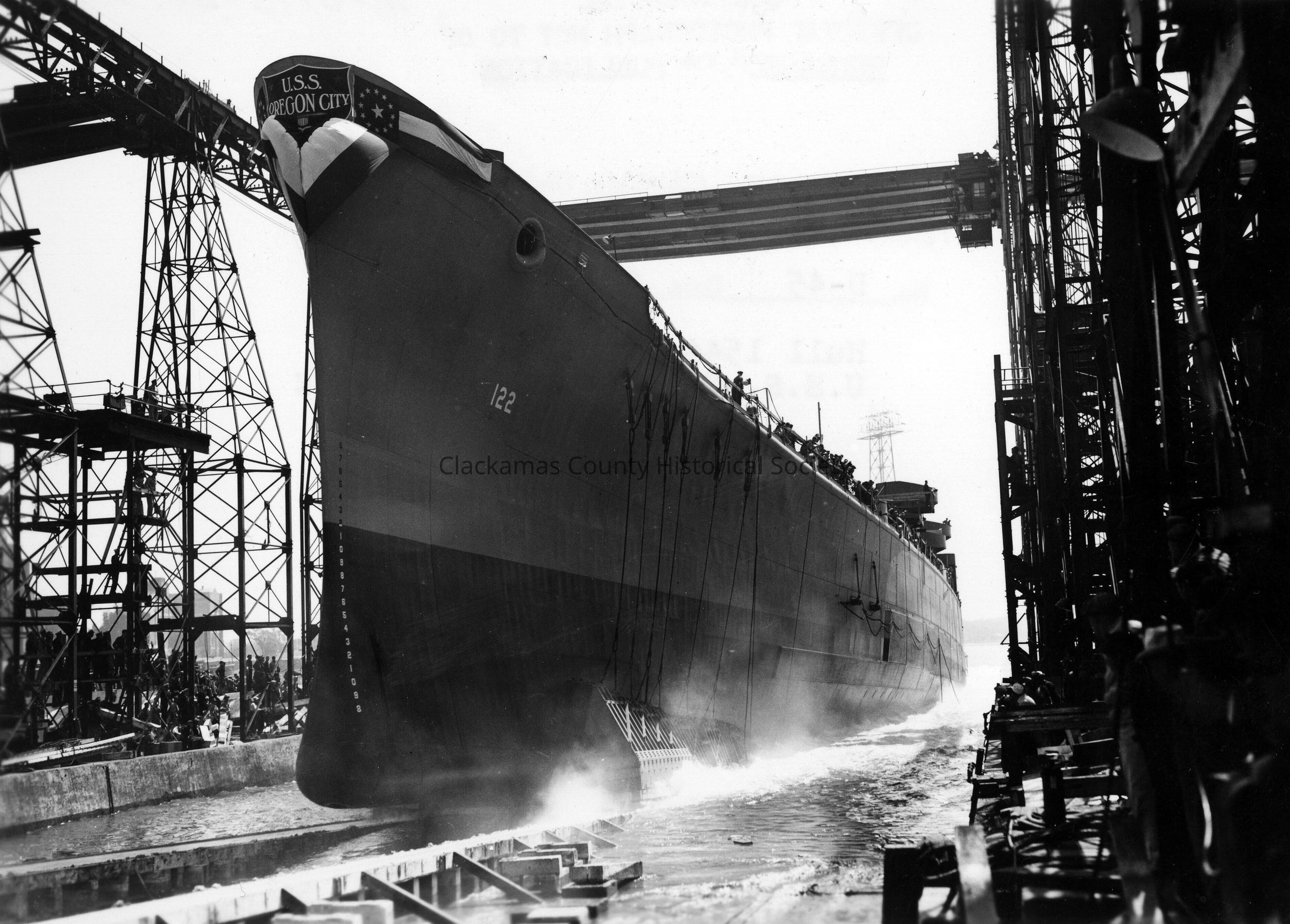 U. S. S. Oregon City, 1945. Launching of ship. June 9, 1945, Quincy, MA. Notable people, including U. S. Representative Mott, Mrs. Ruth Caufield, and others unidentified. Champagne bottle breaking.Made/Created