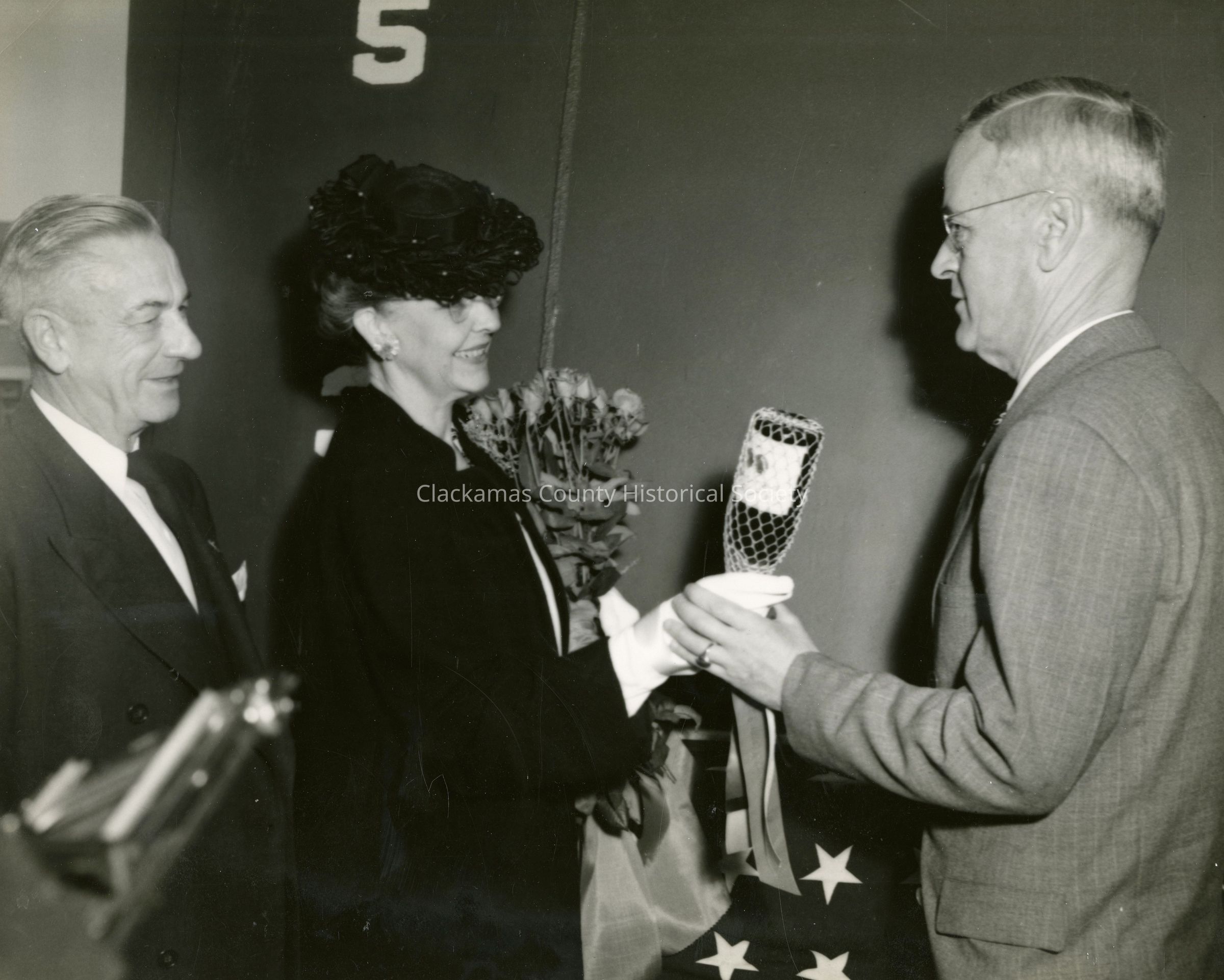 U.S.S. Oregon City, 1945. Launching of ship. June 9, 1945, Quincy, MA. U. S. Rep Mott, Mrs. Ruth Caufield.