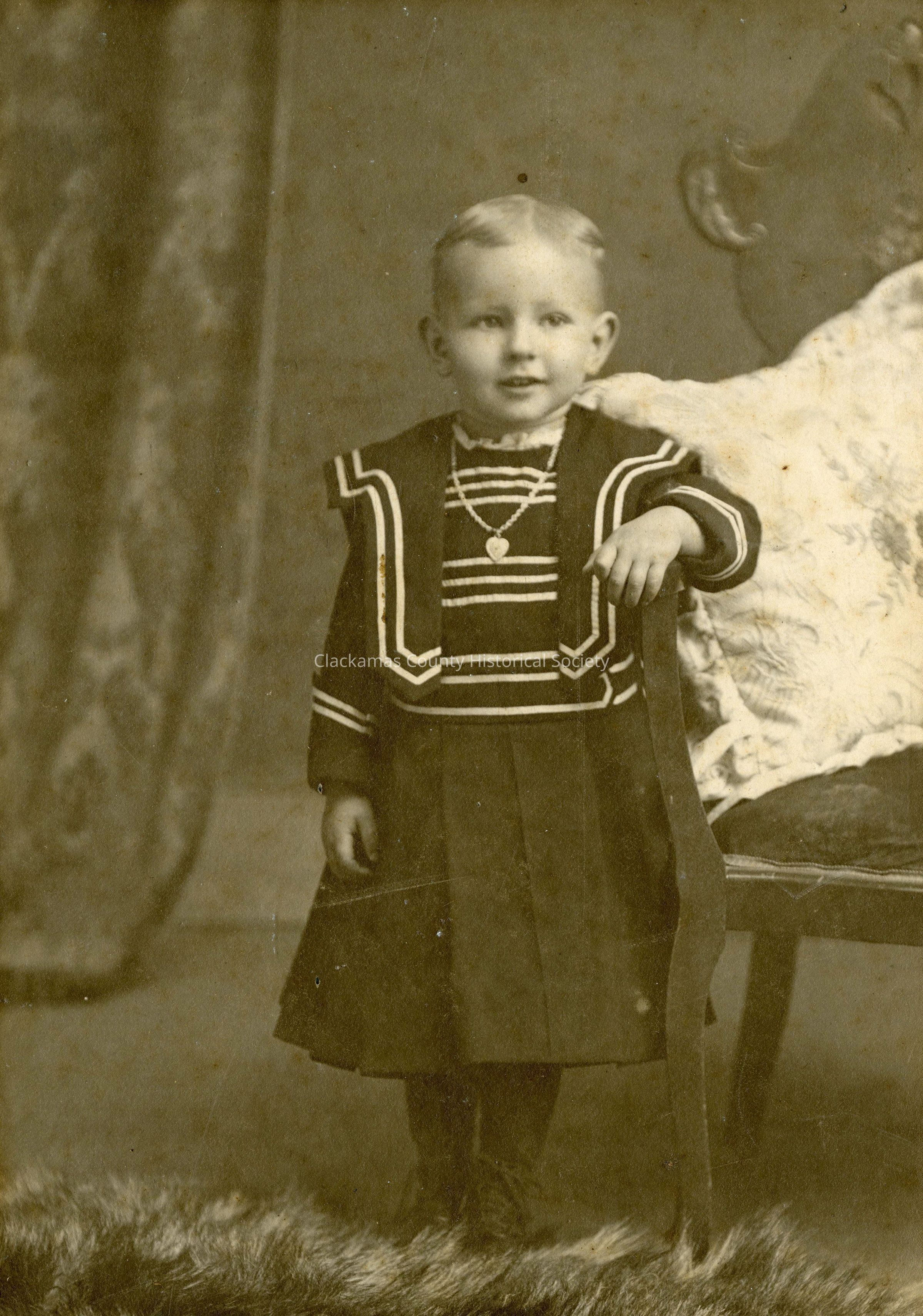Unidentified child standing by a chair. Studio photograph