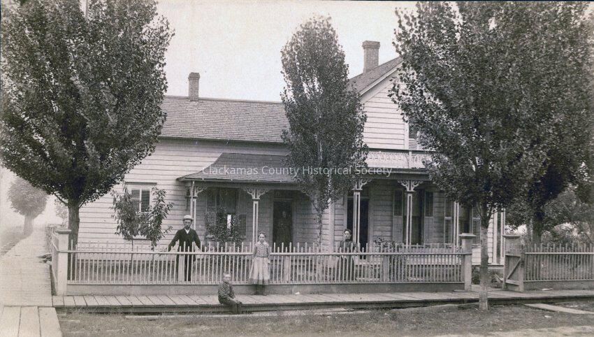 Unidentified Home with family posed. The back of the photograph is printed and refers to "The Mount Shasta Route" using the "Southern Pacific Company's Lines" to travel by train from Portland to San Francisco." It is not dated. Tickets are "$5.00 per Double Berth."Made/Created