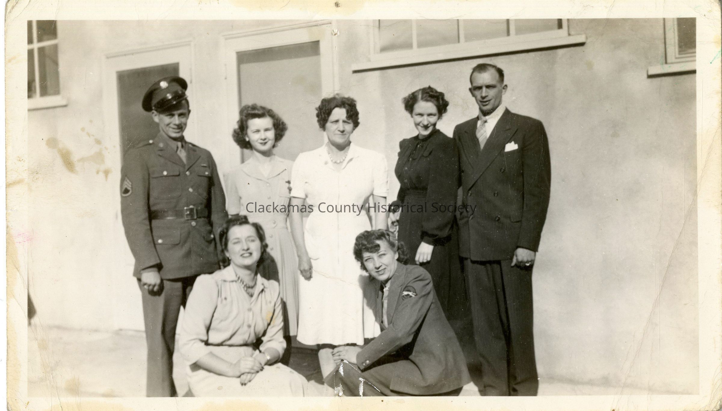 Unidentified people - One soldier with five women and one other man in a group photograph outside a buildingOther Names and Numbers