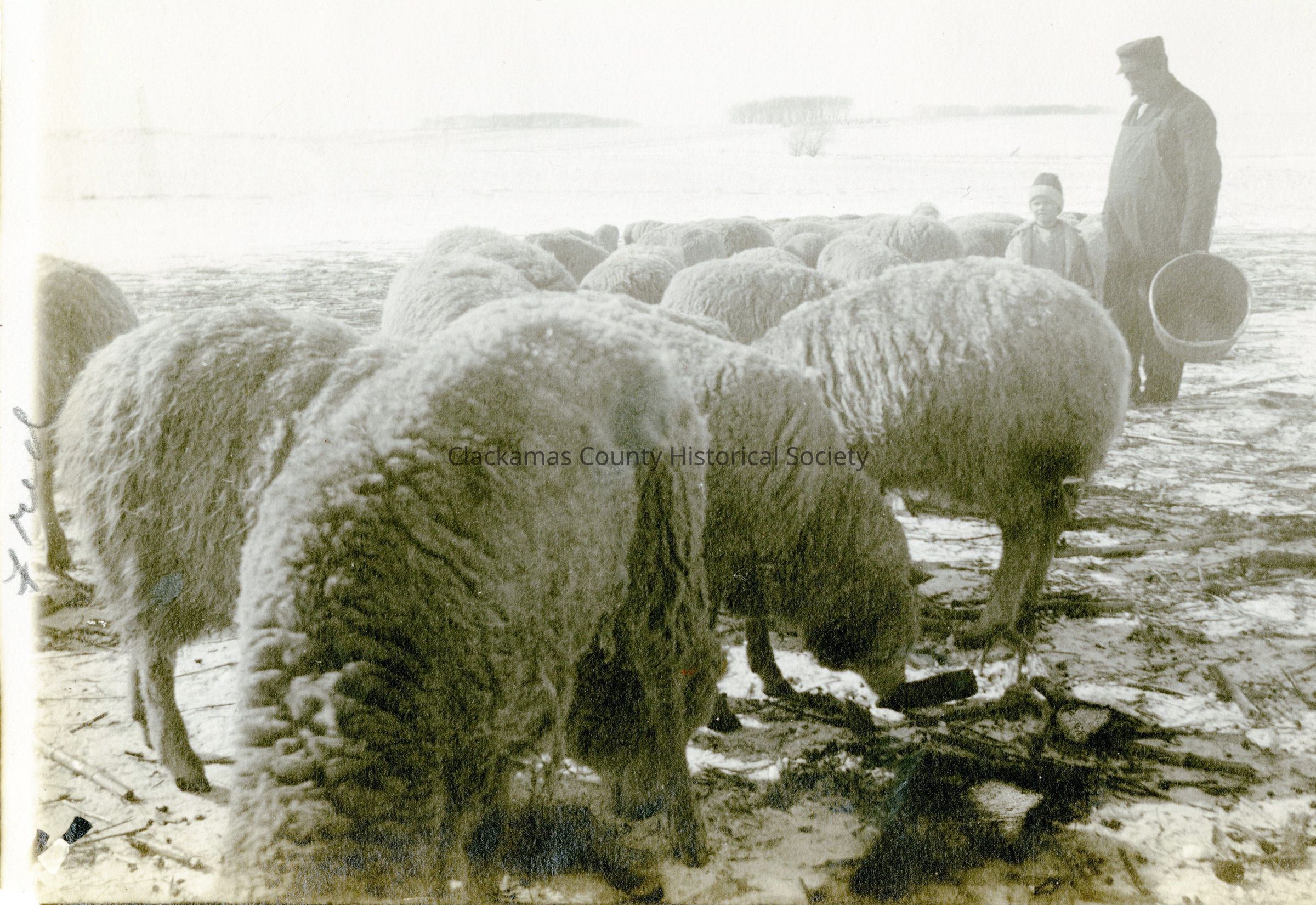 Unidentified man (Fred) with a boy standing in a sheep herd.