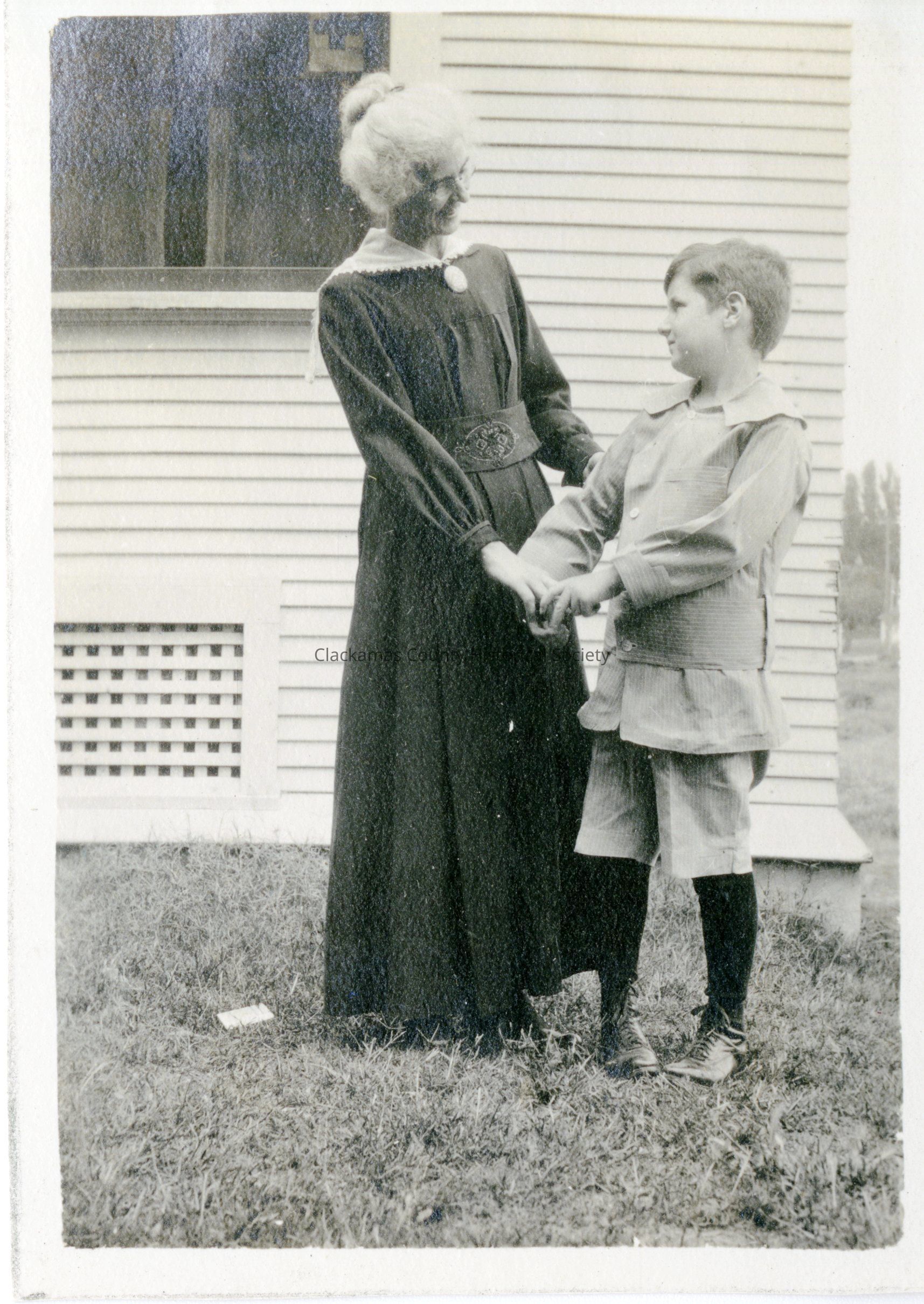 Unidentified woman and young boy holding hands, in front of a houseOther Names and Numbers