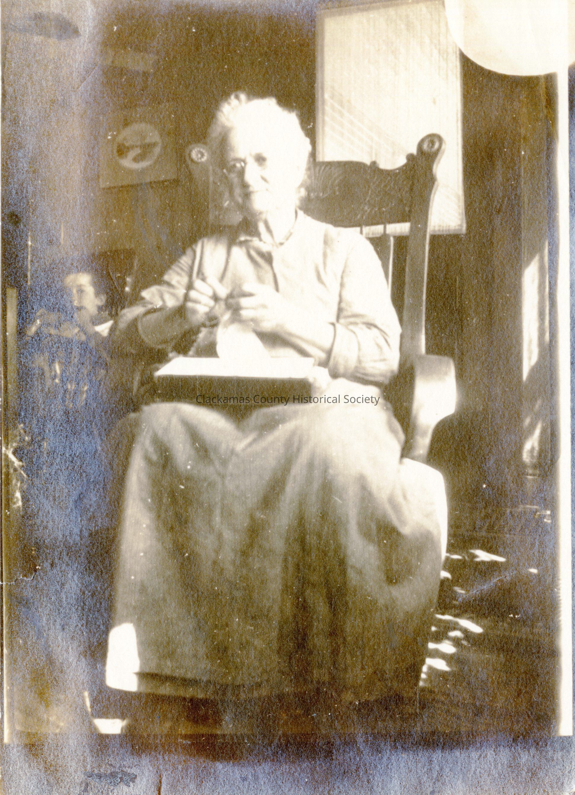 Unidentified Woman - sitting in a chair appears to be doing handwork. Child sitting in a chair behind herOther Names and Numbers