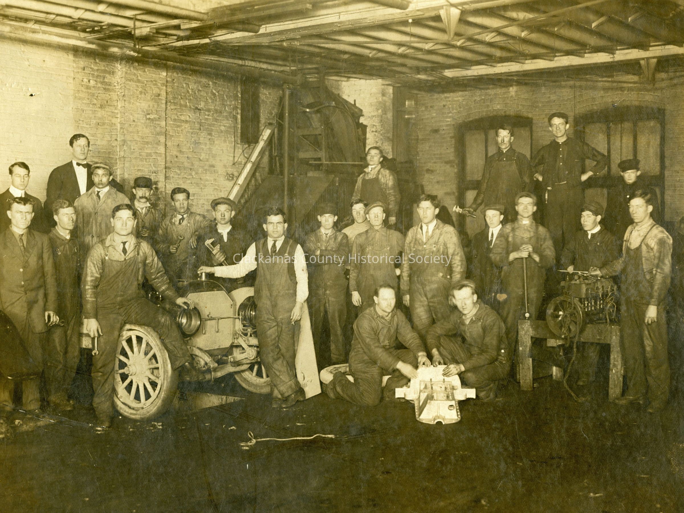 Interior of an Auto Garage and crew. Unknown Location