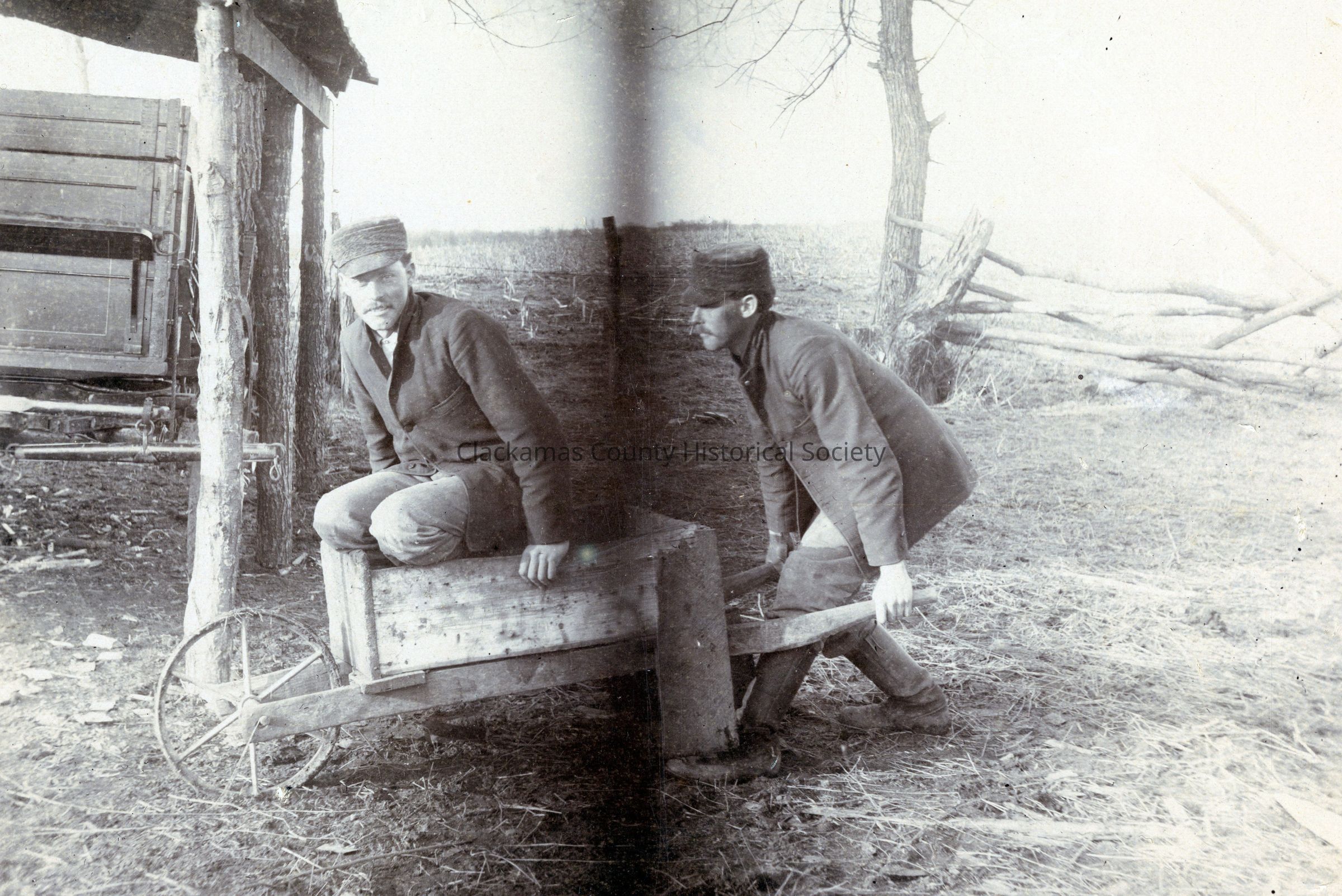 One Man pushing another man in wheelbarrow on a farm. On Back - "Taken Sunday, March 8, 1903, Lez & Lez" 2 Copies P-1050-002793