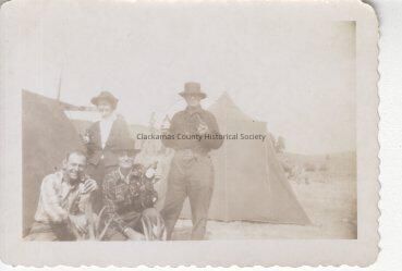 3 men and woman front of tents Cross Collection P-1025.000170