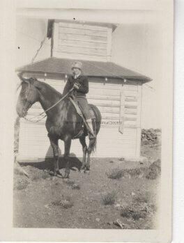 Unknown Woman on Horse in front of building - Cross Coll