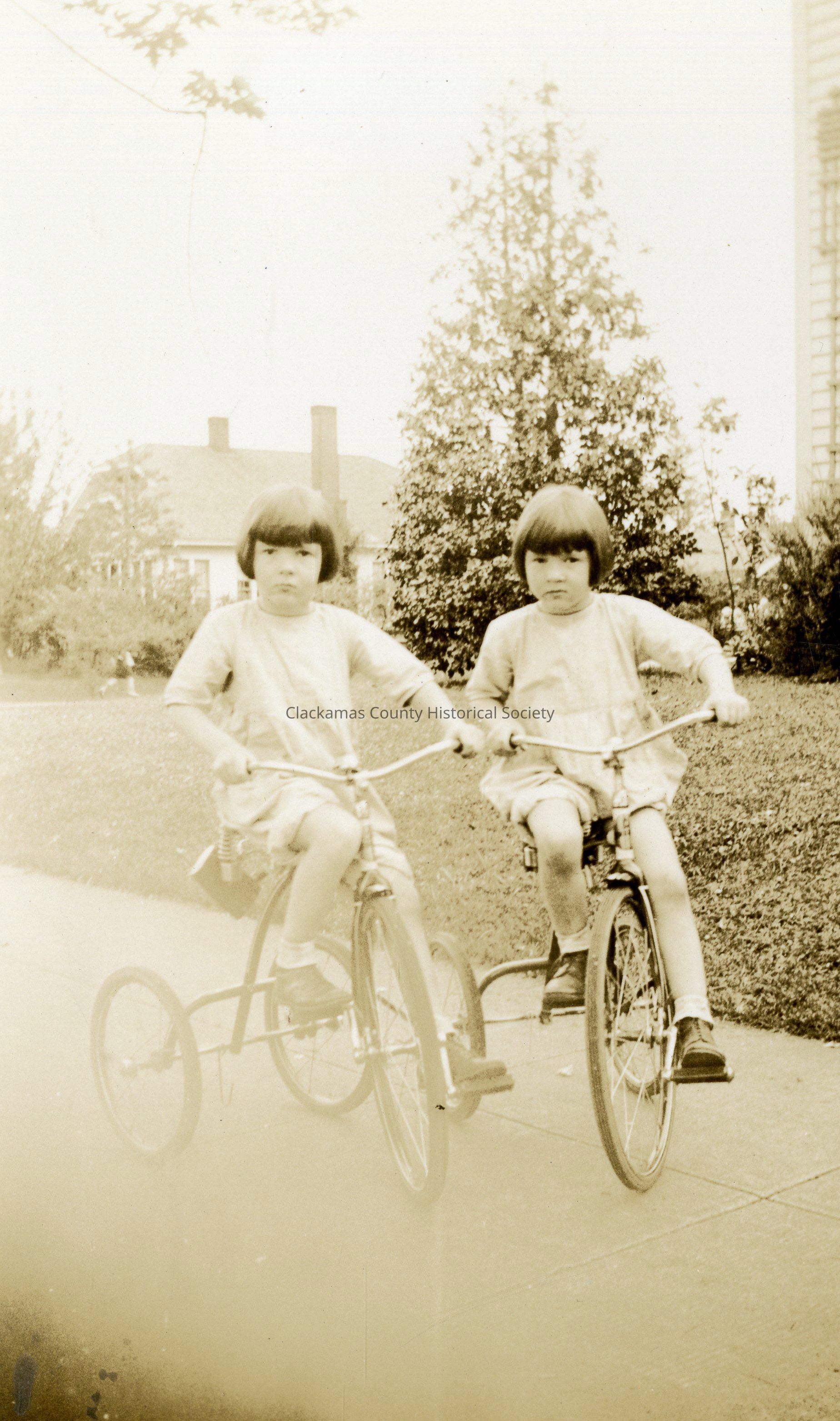 Unknown Young Girls Riding Tricycles on Sidewalk (Twins?)