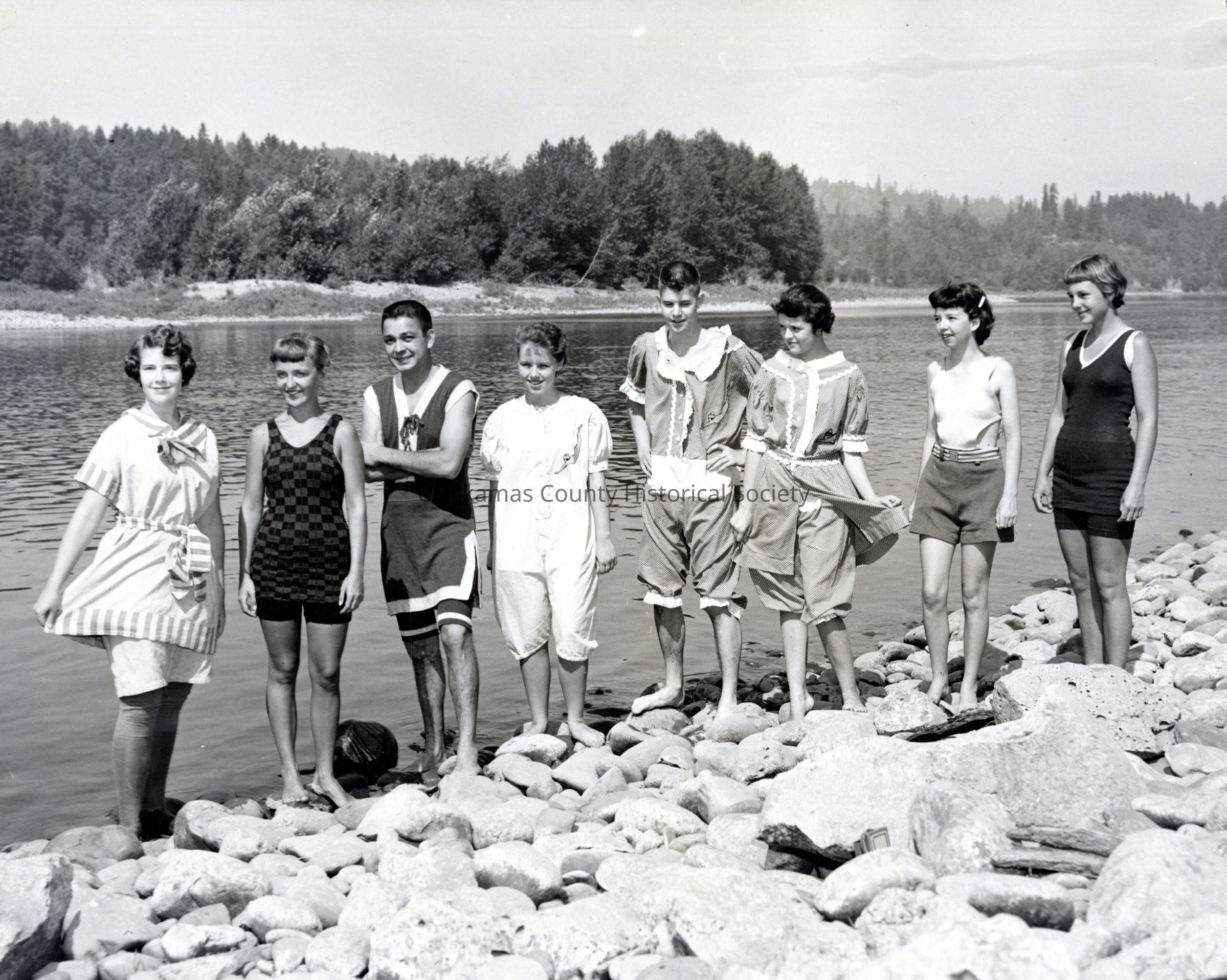 Eight Unknown Young People - On Rocky Beach in Various Styles of SwimsuitsMade/Created