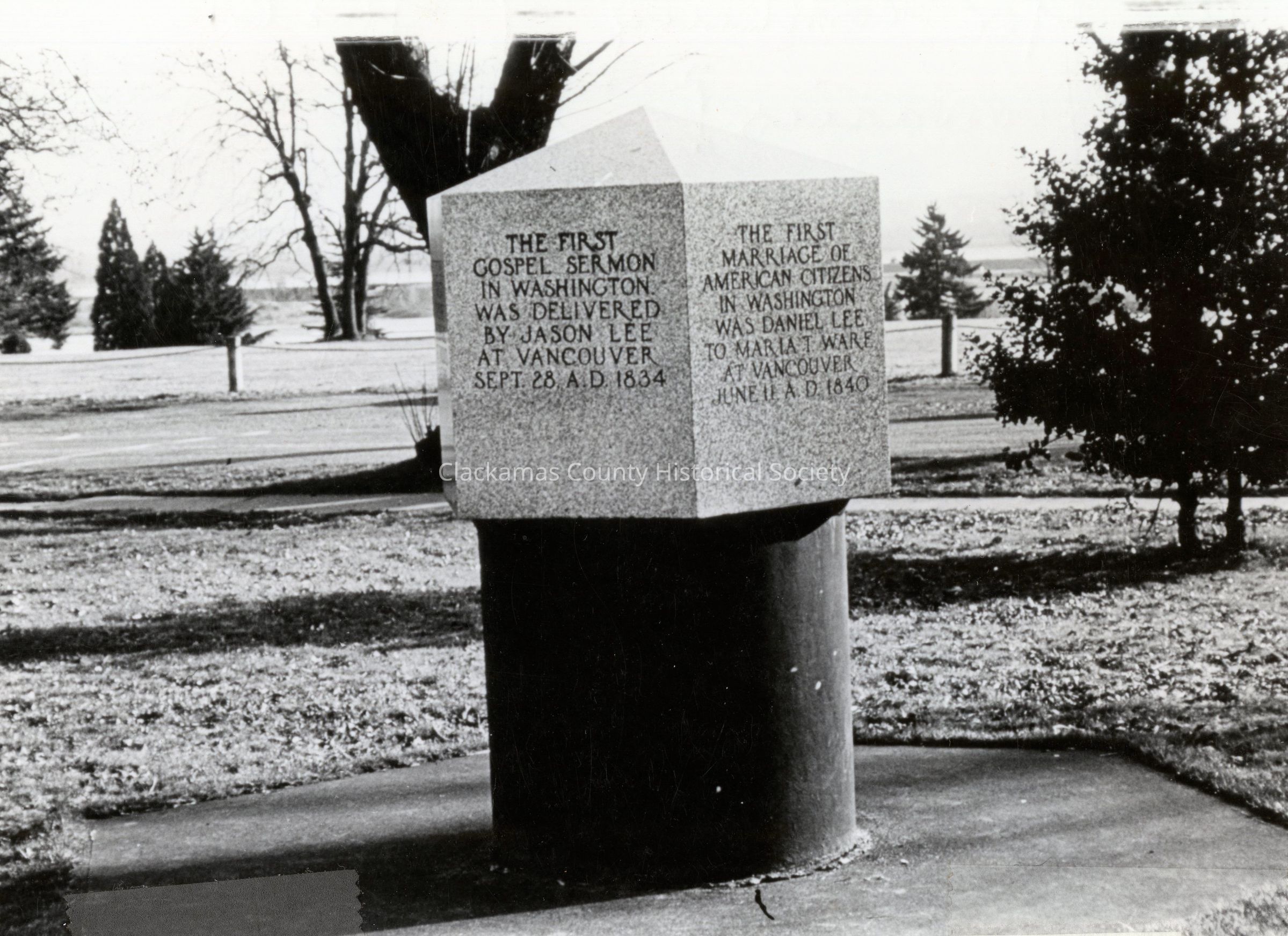 Erected in 1925 - Six Sides. This Photo Shows "The First Gospel Sermon in Washington was delivered by Jason Lee at Vancouver, Sept 28 A.D. 1834" and "the first Marriage of American Citizens in Washington was Daniel Lee to Maria T. Ware at Vancouver, June 11, A.D. 1840."