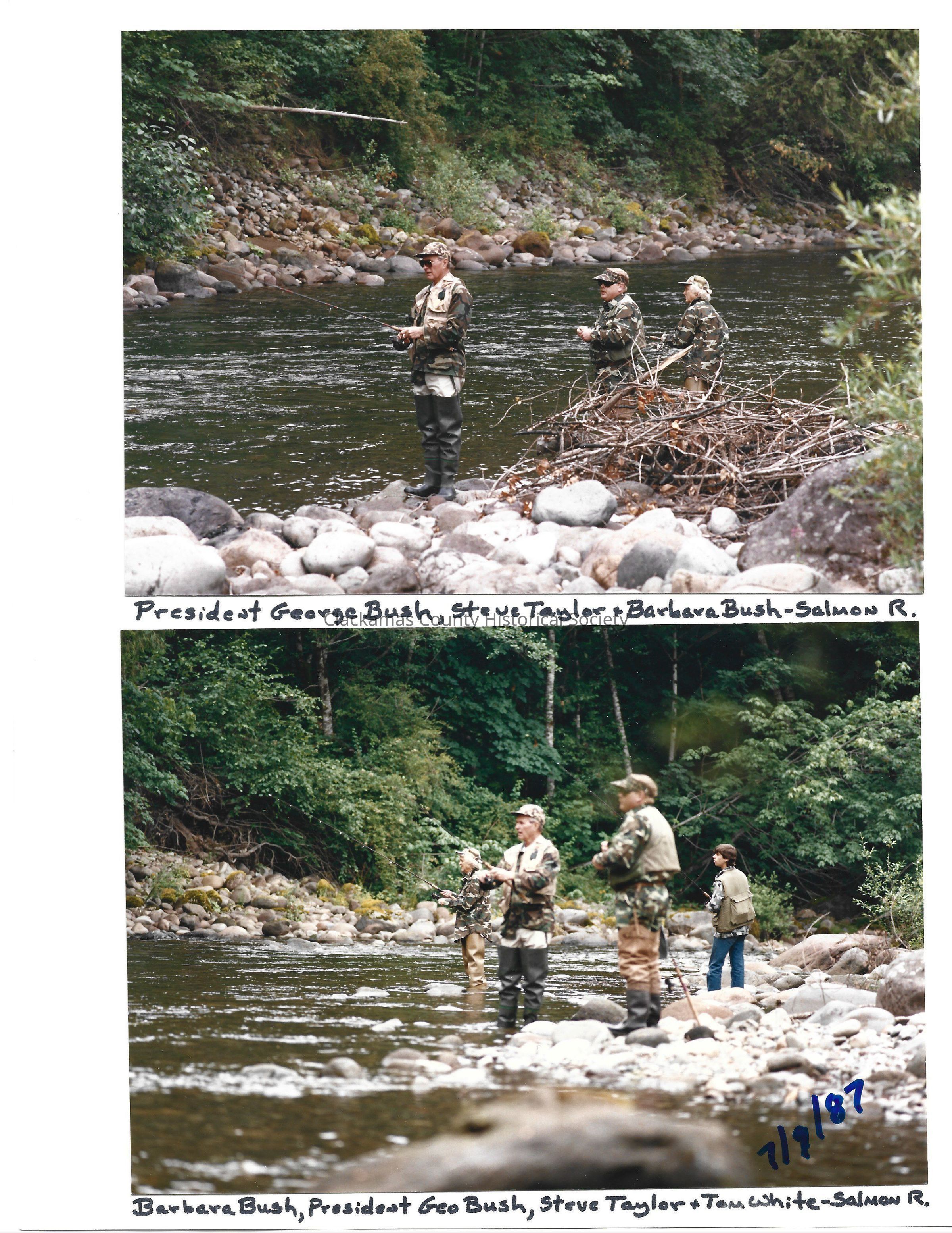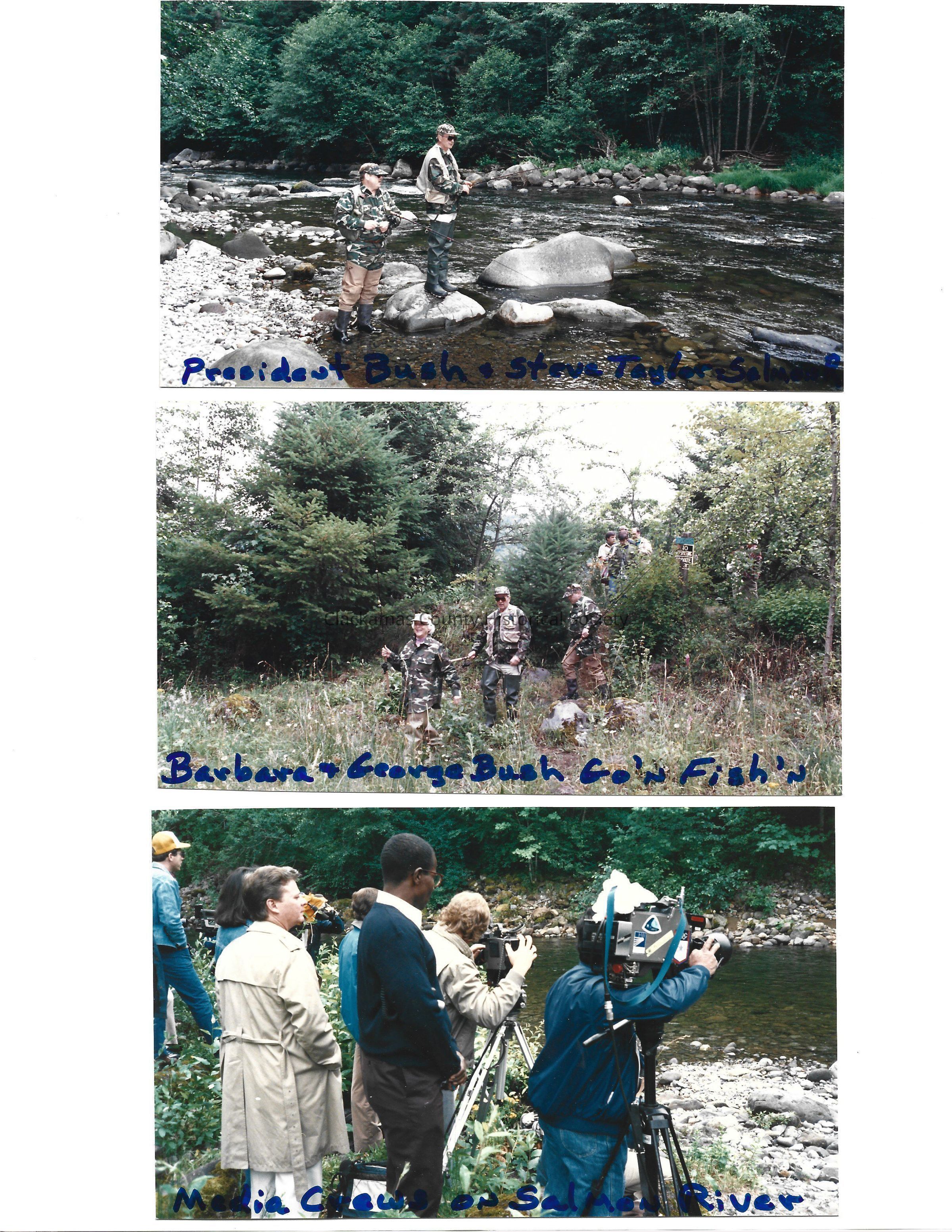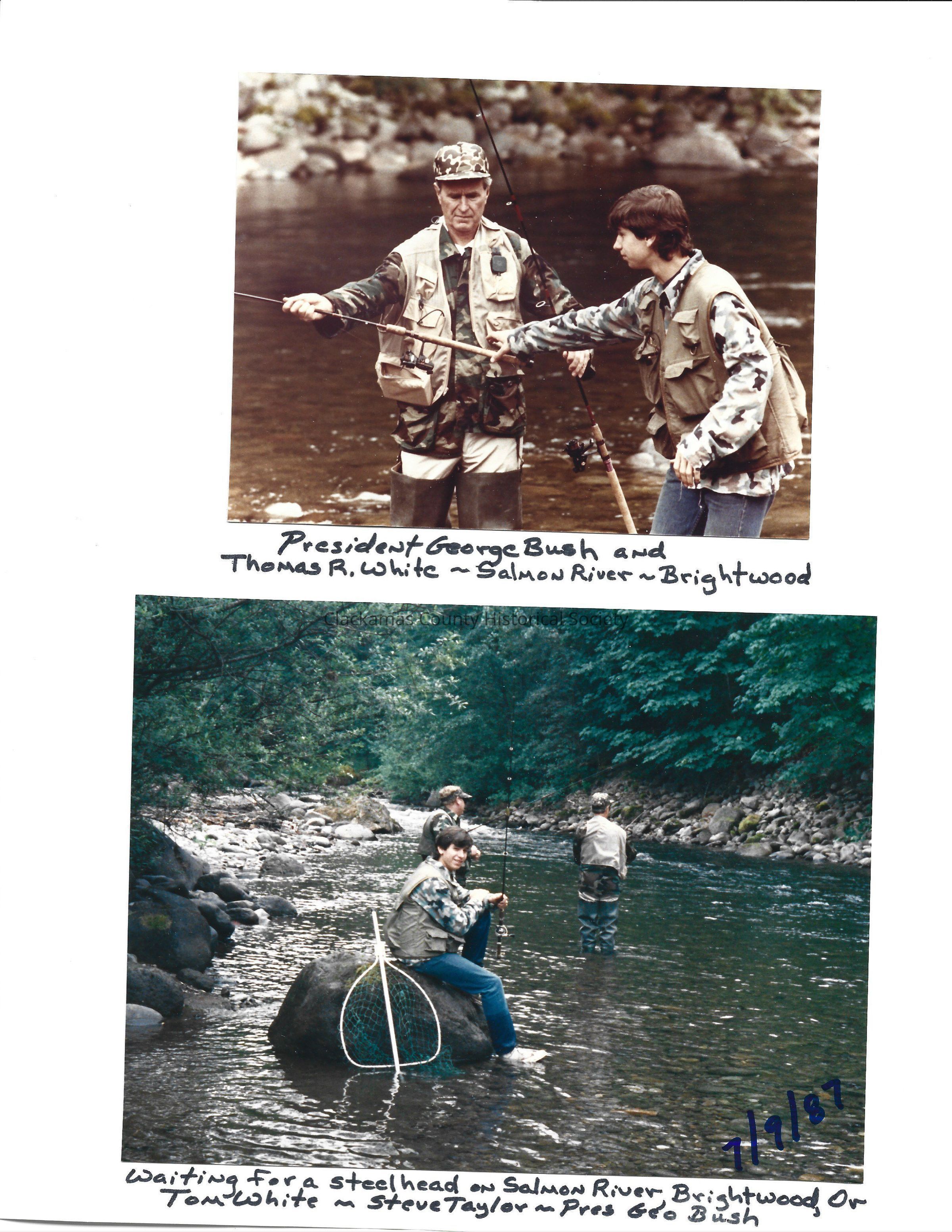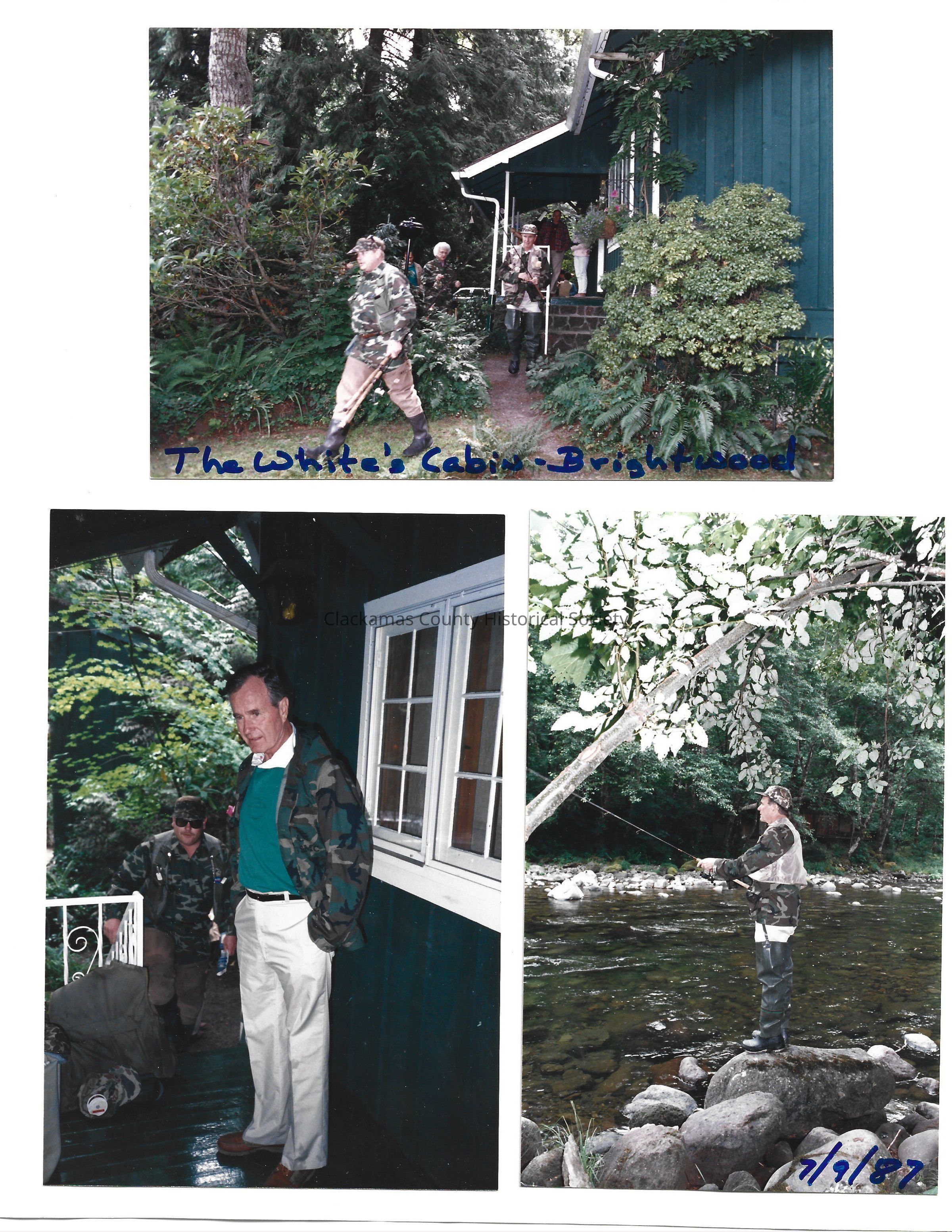 Series of 10 photos memorializing the visit of then Vice President and Mrs. Bush to the Brightwood area. Fishing photos. Pictures also show the Salmon River and the White's cabin. Others attending, Steve Taylor and Tom White.