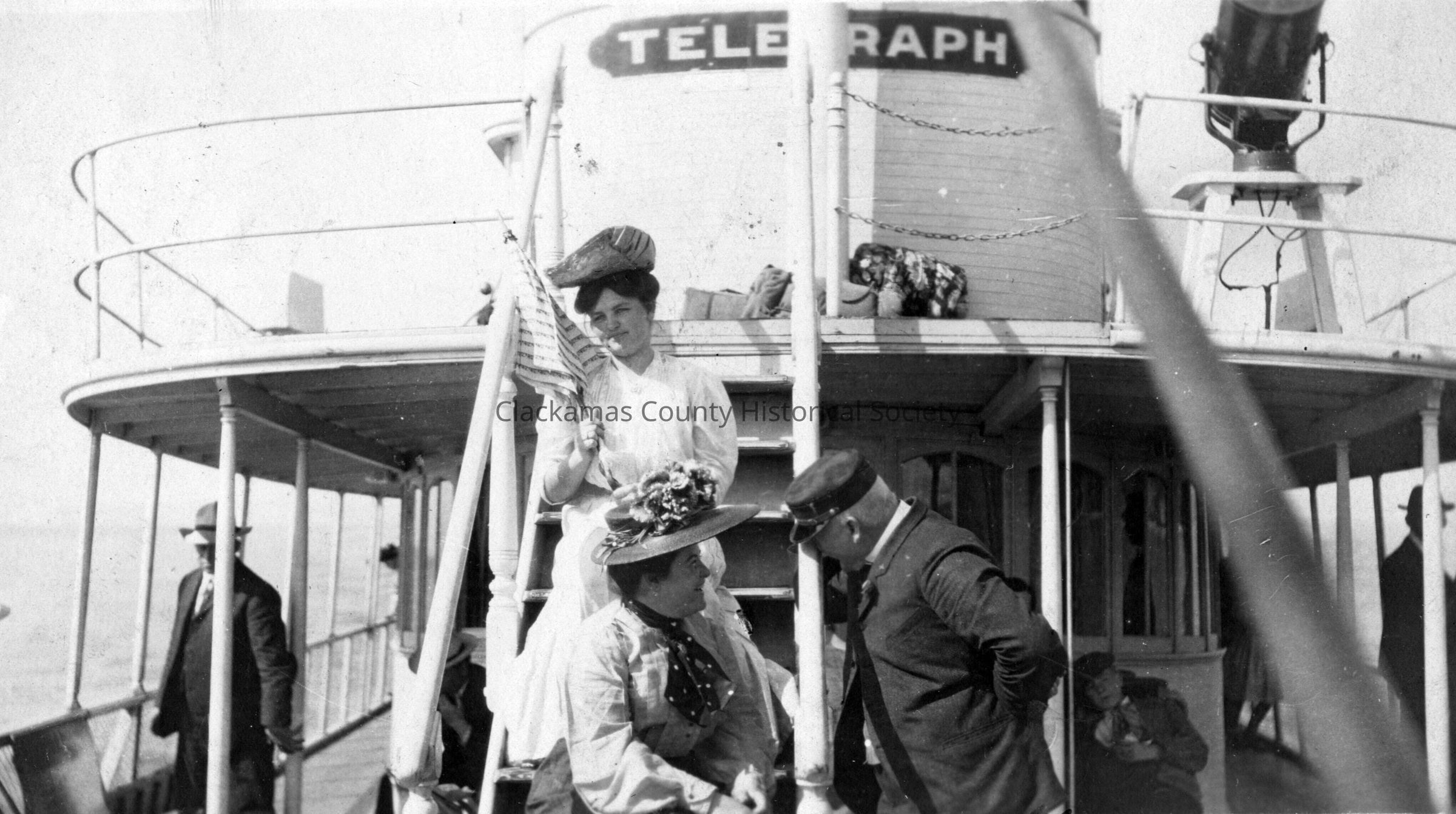 Wallie Mauzey on Passenger Boat. He is talking to two women passengers.Made/Created