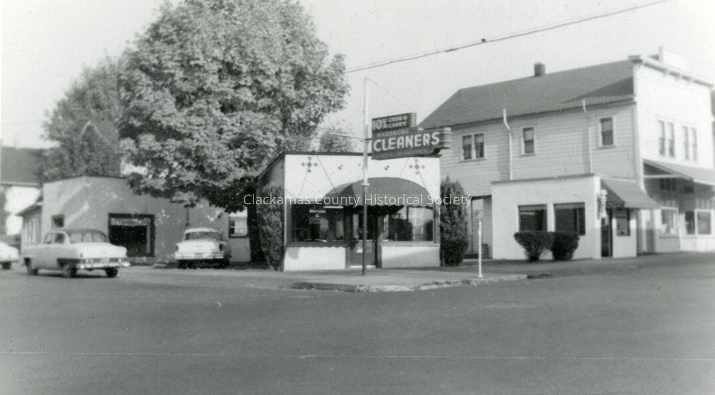 Wardrobe Cleaners located at 7th and Center Streets, Oregon City, Oregon. Cleaners is located in old service station. Photo shows barber shop next door.Made/Created