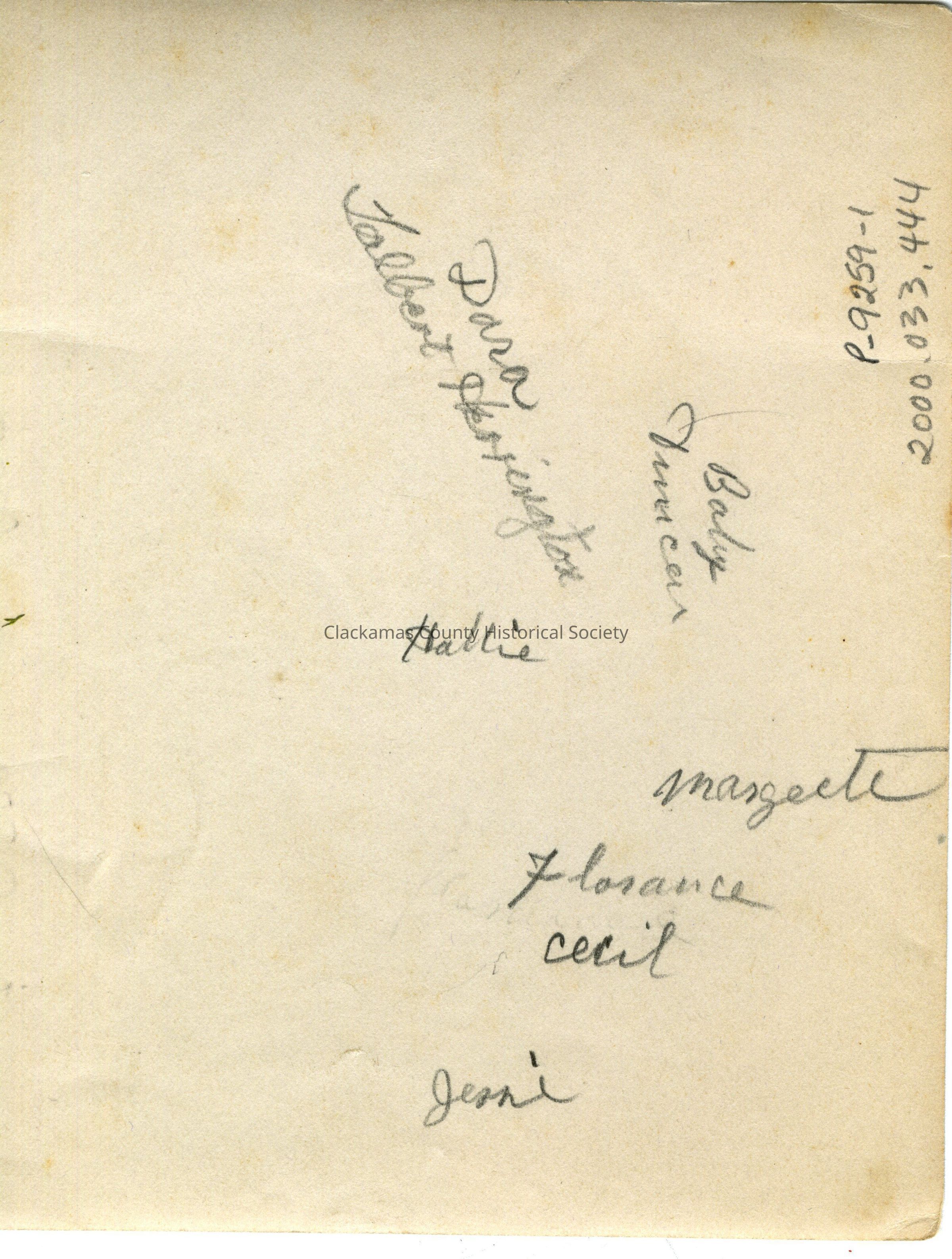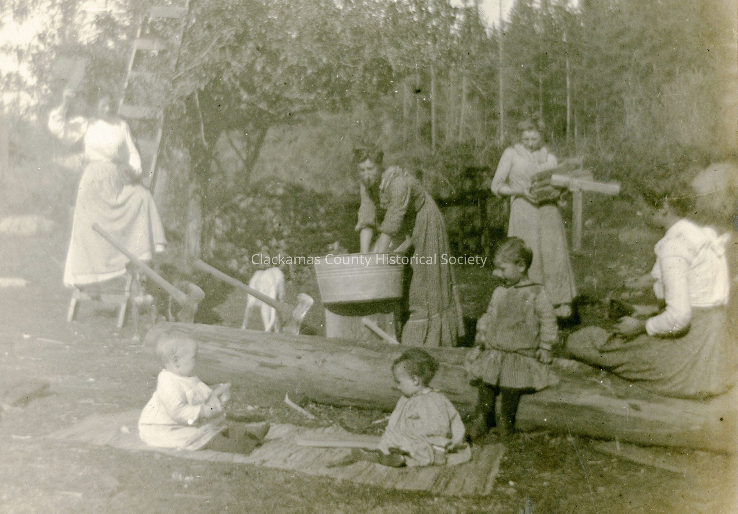 Women and children outdoors on washday. Dora (Talbert) Herrington, Baby Duncan, Hallie, Margrete, Florance, Cecil, Jessie (Talbert) Ryckman.Other Names and Numbers