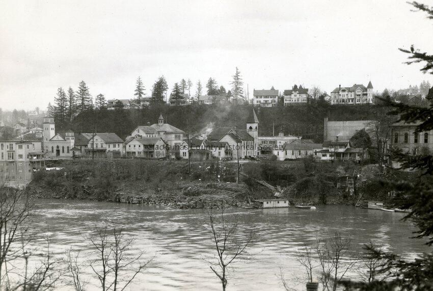 Waterfront from 8th to 10th St., Oregon City, 1929. Houses in the background: (right) Eastham-Morey-Caufield - demolished, (second from right) Walden/Frank Mount House - demolished 1950, (third) Hugh Mount house - still standing. The structure on the far left, across the street from St. John's Catholic Church is the E.E. Charman house, which moved to a new foundation, and repurposed as apartments (JAH 12/2022).Made/Created