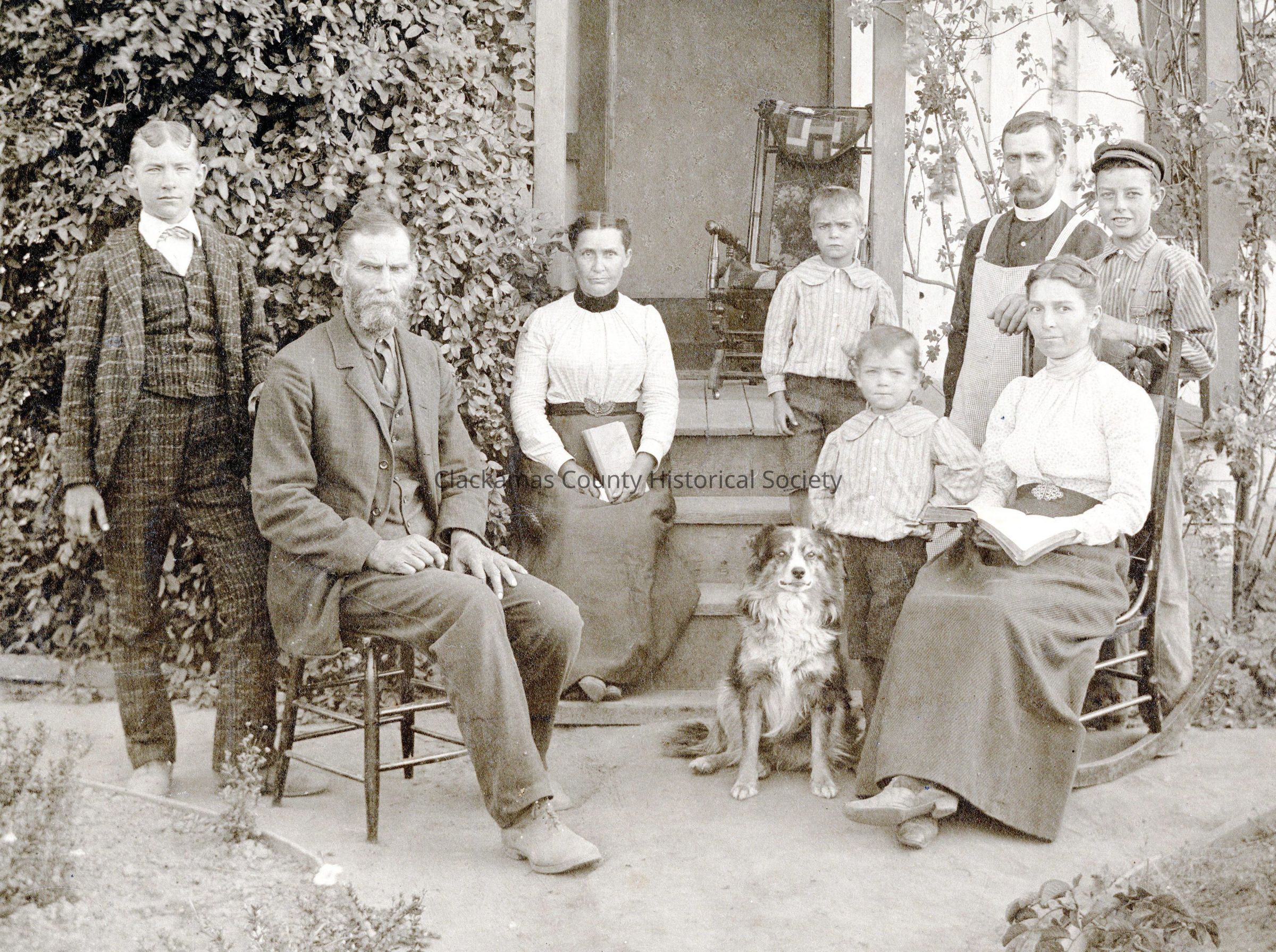 Edna Hillie Welch and family with their dog poised in front of a house. The names A. Palmerteer; Aunt Anna Uncle Dan & Earl are written in ink on the back. It is unknown how those names relate to the people in the photograph.