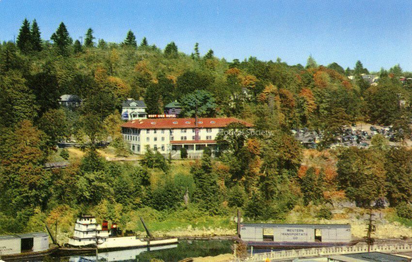 West Linn Hotel (West Linn Inn). Color postcard. Info on back: A quiet, comfortable hotel on the west bank of the beautiful Willamette River overlooking historical Oregon City - just 12 miles south of Portland.Made/Created