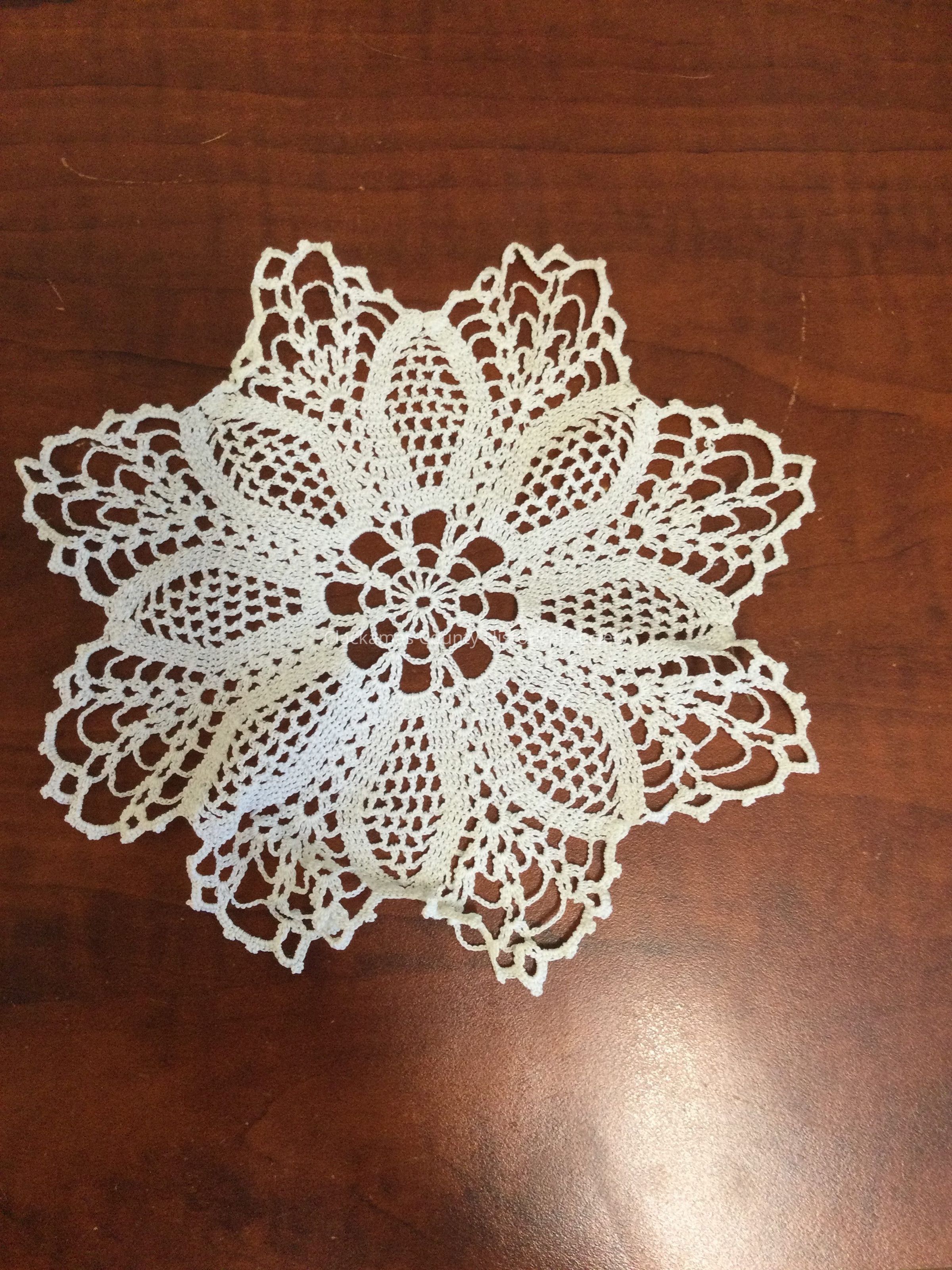 Medium sized white doily in good condition. Pointed fine lace edges. Flower-shaped