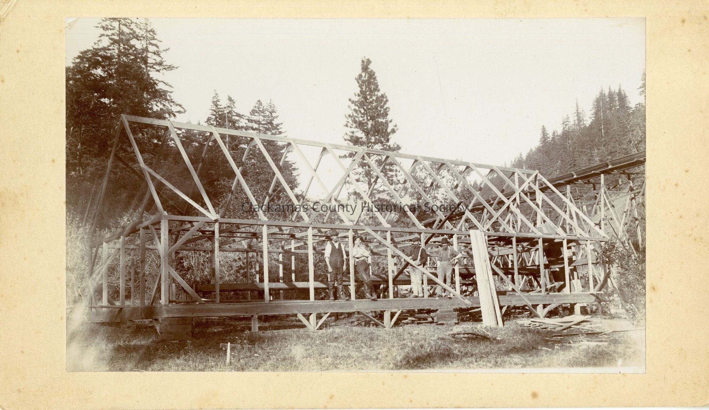 Shows construction methods. Early 20th Century. First hatchery at White Salmon, Washington. First man on left is John A. Talbert