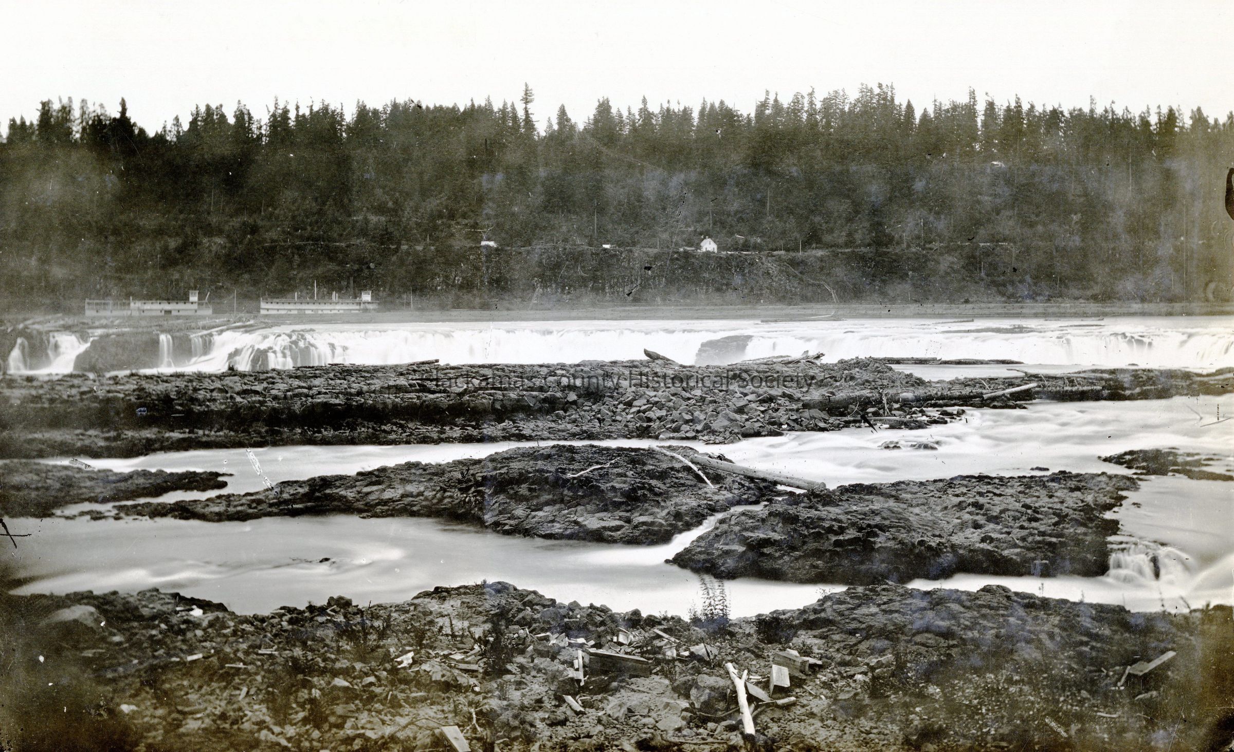Willamette Falls from West Linn Side of River. 1868. Two steamboats in background W-1450.003610 Negative and Sample print added to envelope 1/14/2024