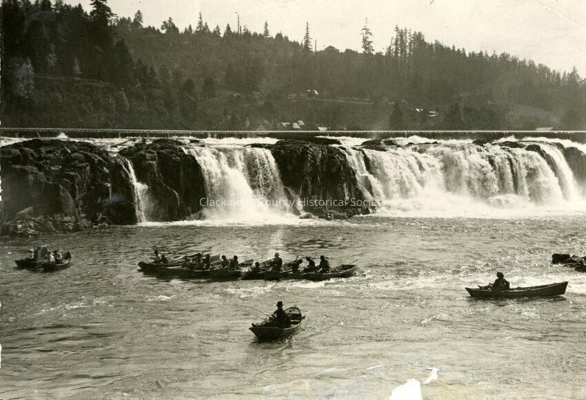 Salmon fishing at foot of Willamette Falls during "Spring Run".