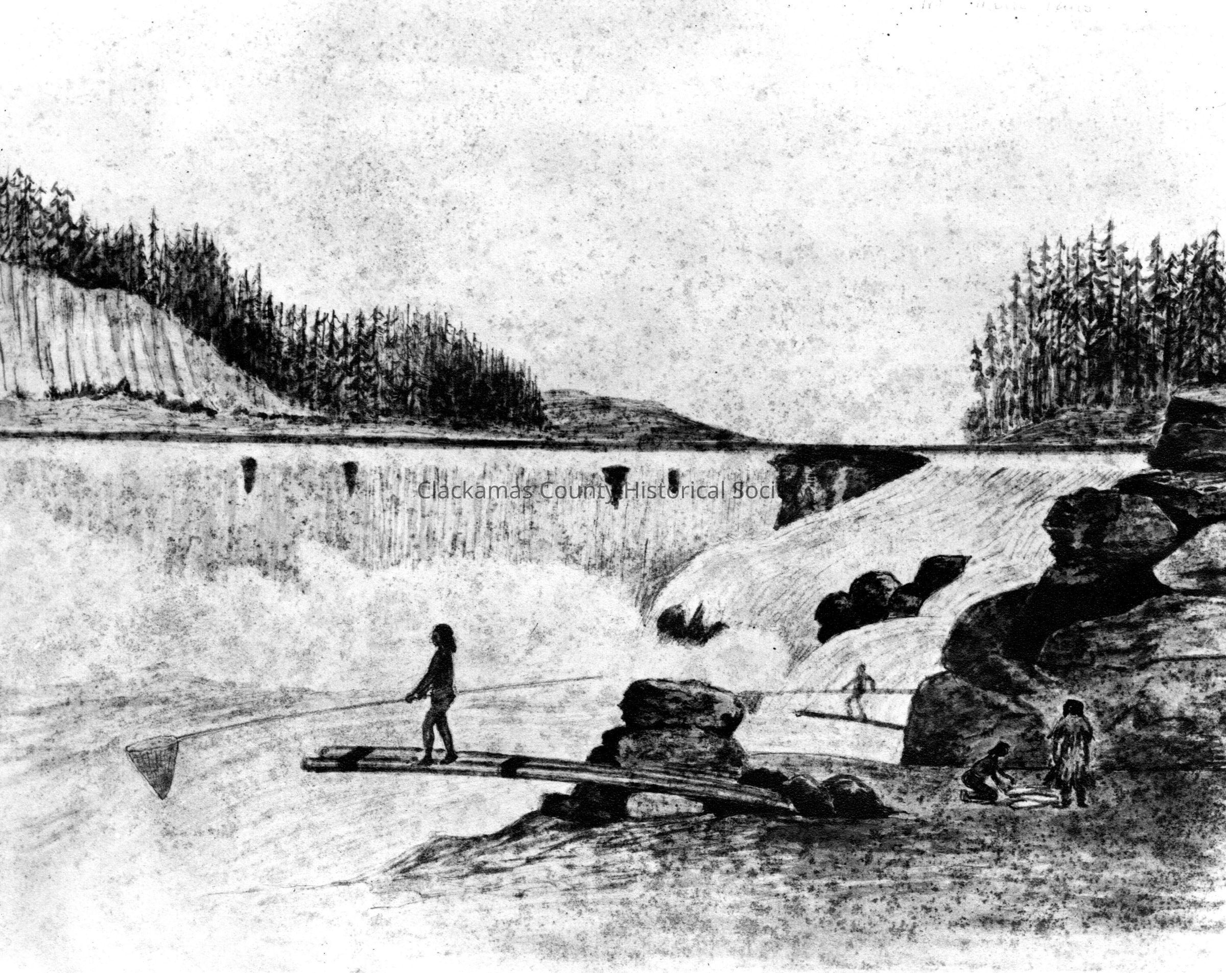 Sketch of Willamette Falls, Native American Fishing. Wilkes Expedition, ca. 1841. Joseph Drayton sketch. Charles Wilkes Expedition.Made/Created