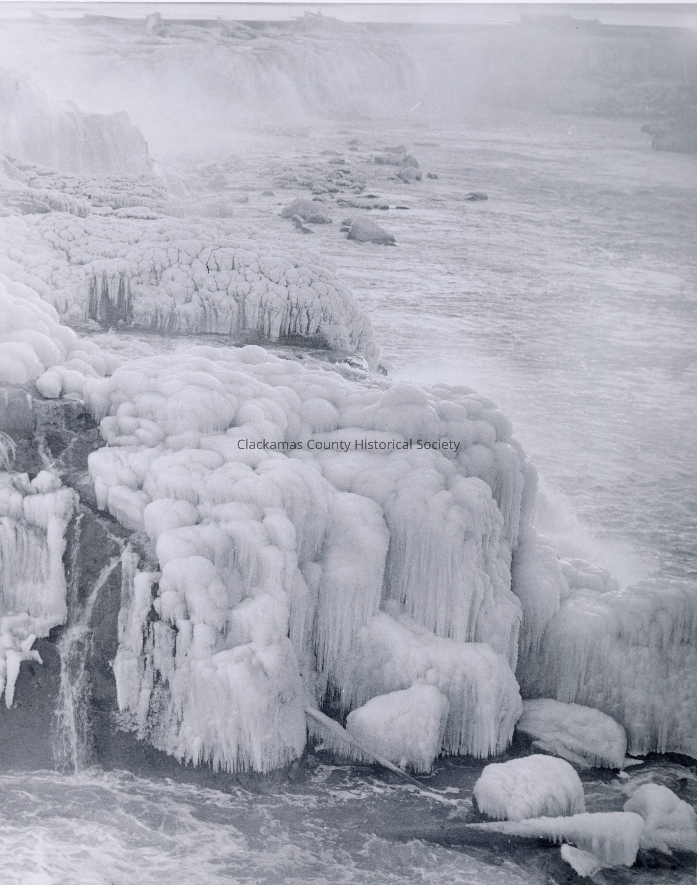 Willamette Falls 1/27/1957 Frozen Scene Oregon City - Photo by Guy Barnett, 815 Van Buren Street, Oregon City
