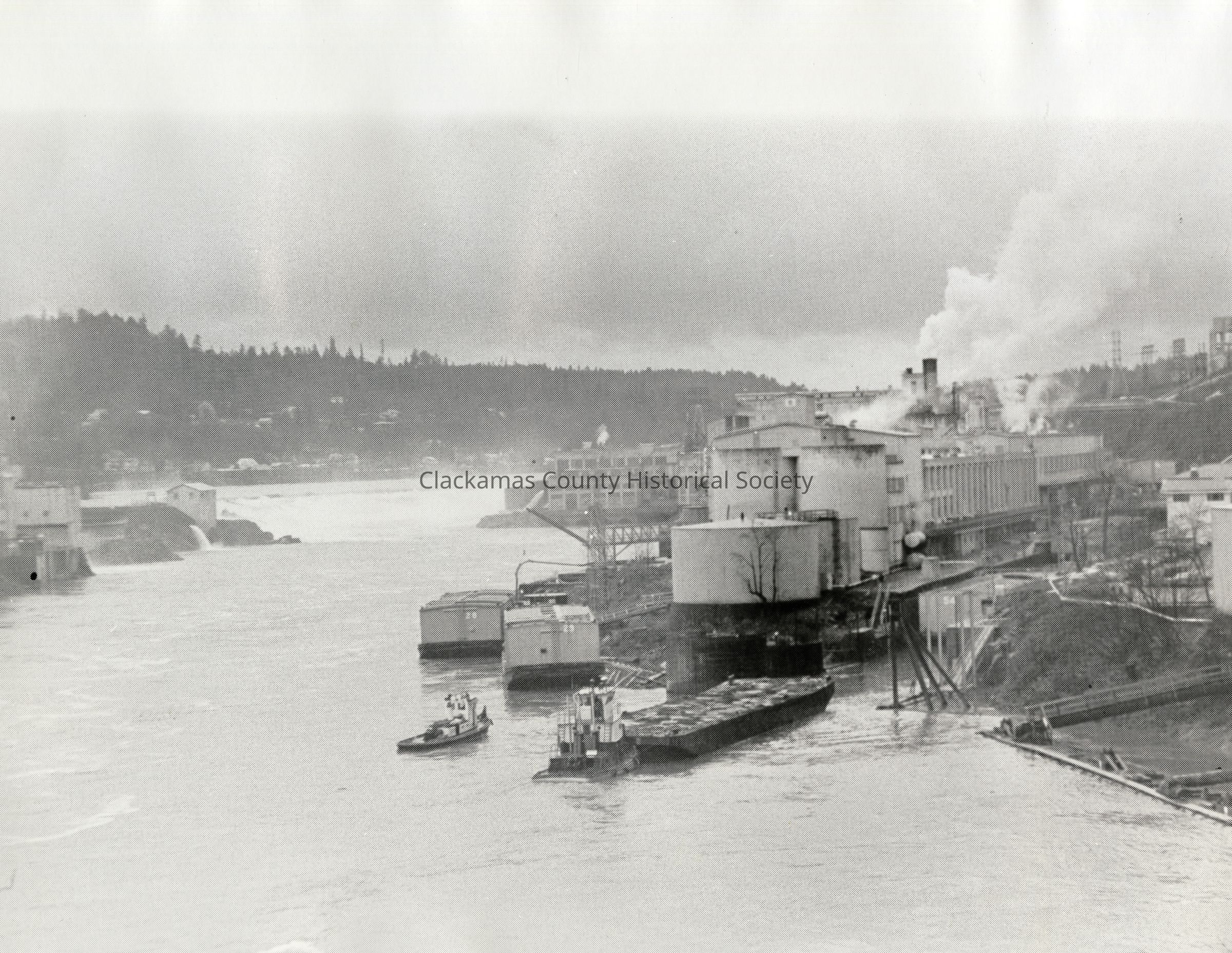 Willamette Locks and Falls Paper mill Smoke stacks Power house and transfer site Tug entering the locks Barge