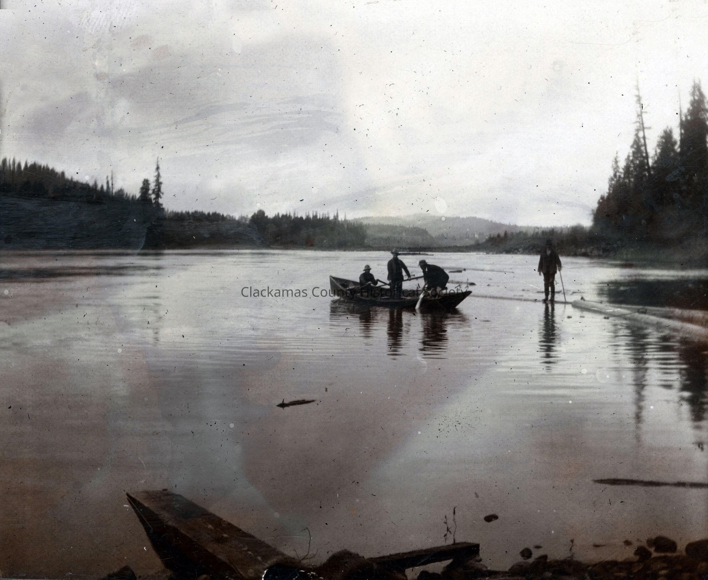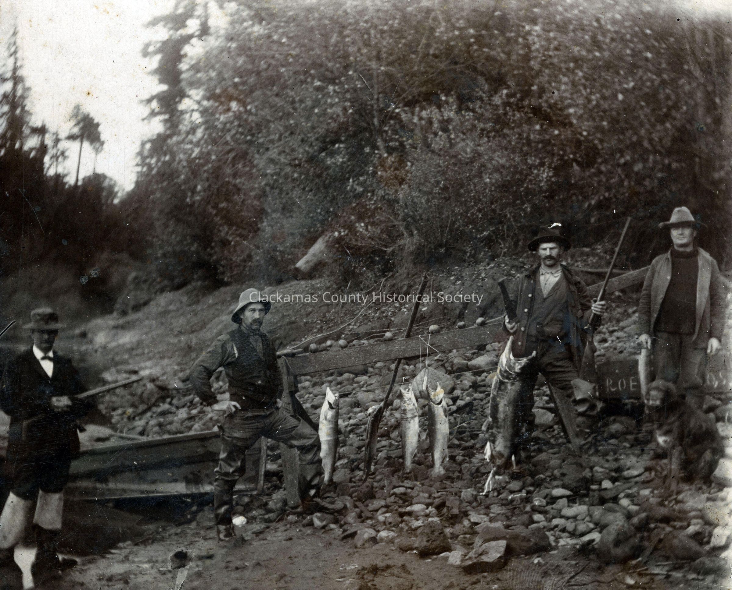 Willamette Fishing Photos. 2 photos. Photo A) Men in boat at Rothe's Landing: Phil Oatfield, Ed Roethe, Paul Roethe, and Cliff Mattoon. Photo B) Men with Fish at Roethe's Landing (L-R): 1) Phil Oatfield; 2) Cliff Mattoon, 3) ?; and 4) Paul Roethe. P-3128 and P-3129Made/Created