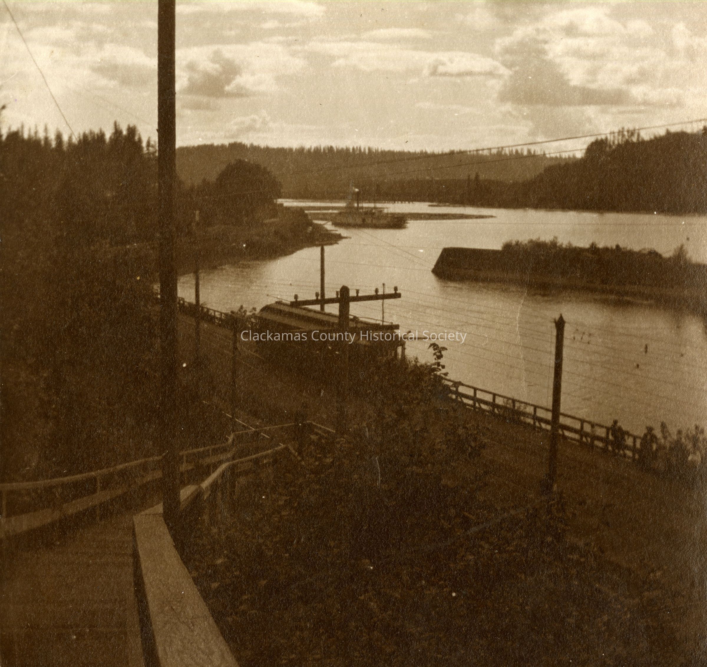 Willamette River above Falls at Boat Basin with Steamboat and Trolley Car