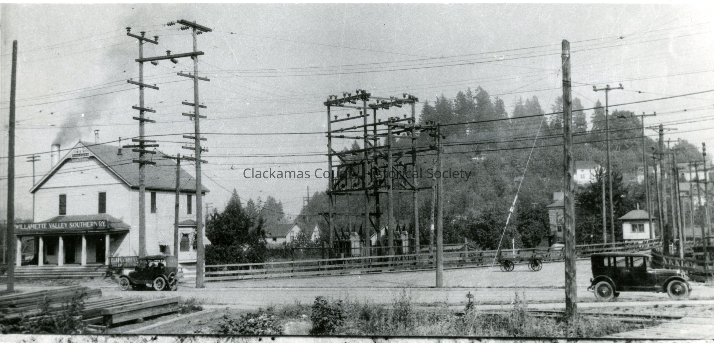 Willamette Valley Southern R.R. Station and Junction with Interurban Streetcar Line. Oregon City, 15th and Main Streets. 1926