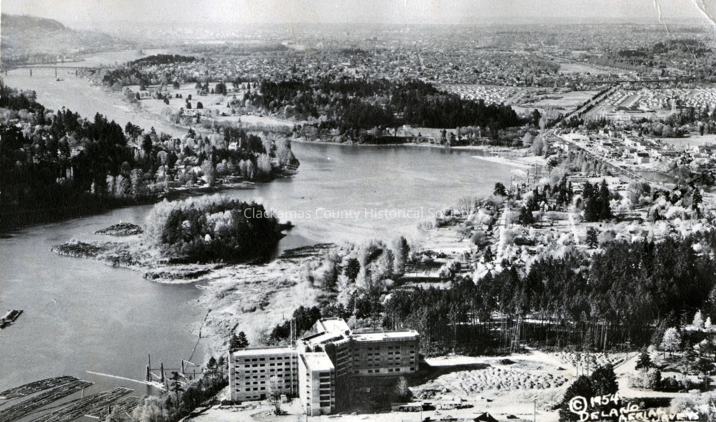 Aerial View of Willamette View Manor, Portland, Oregon, 1954. In the background, you can see the Sellwood Bridge and Elk Rock IslandMade/Created