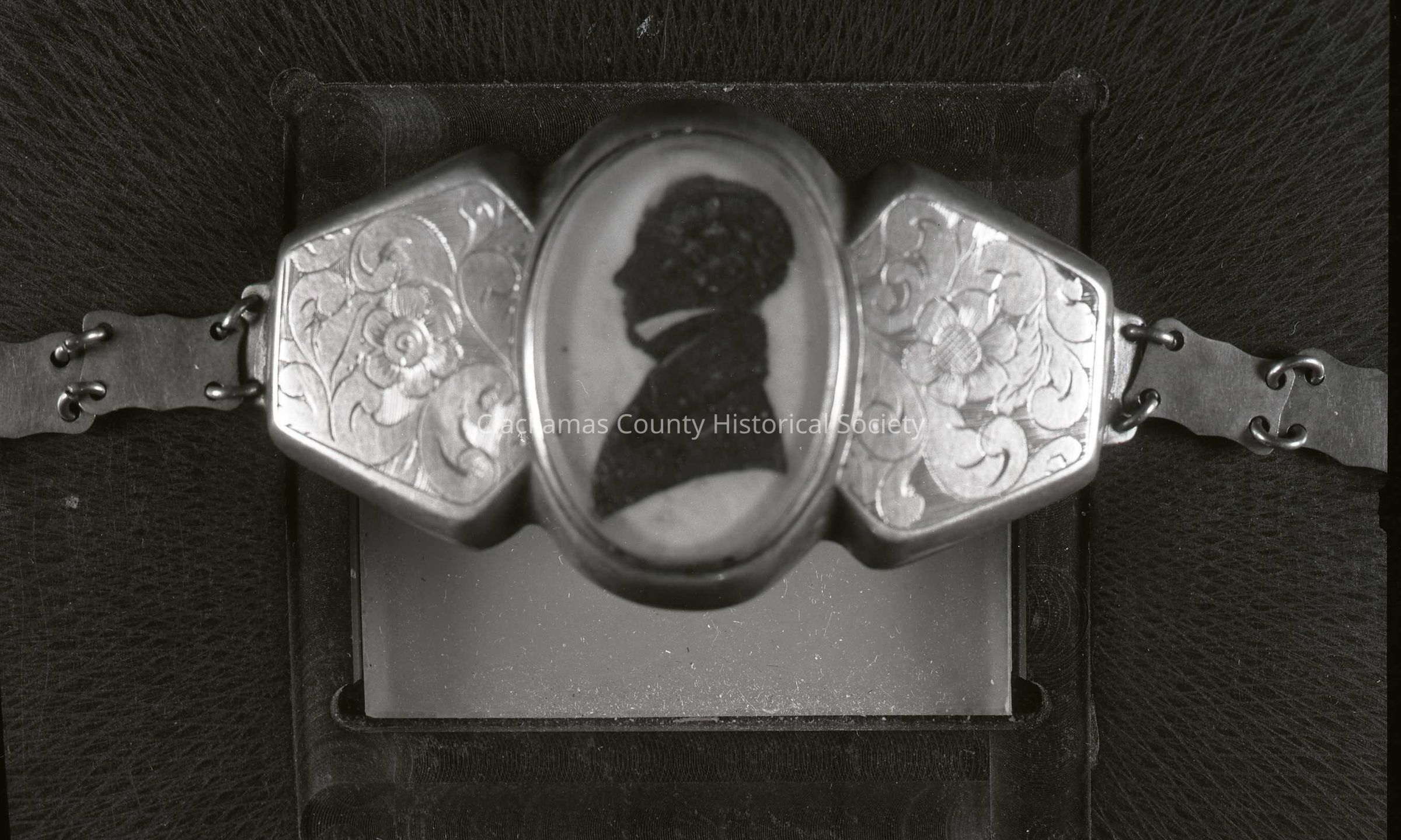 Photograph of a silhouette on a bracelet (1860's) that William Glen Rae gave his wife, Eloise McLoughlin, who was the daughter of Dr. John McLoughlin.