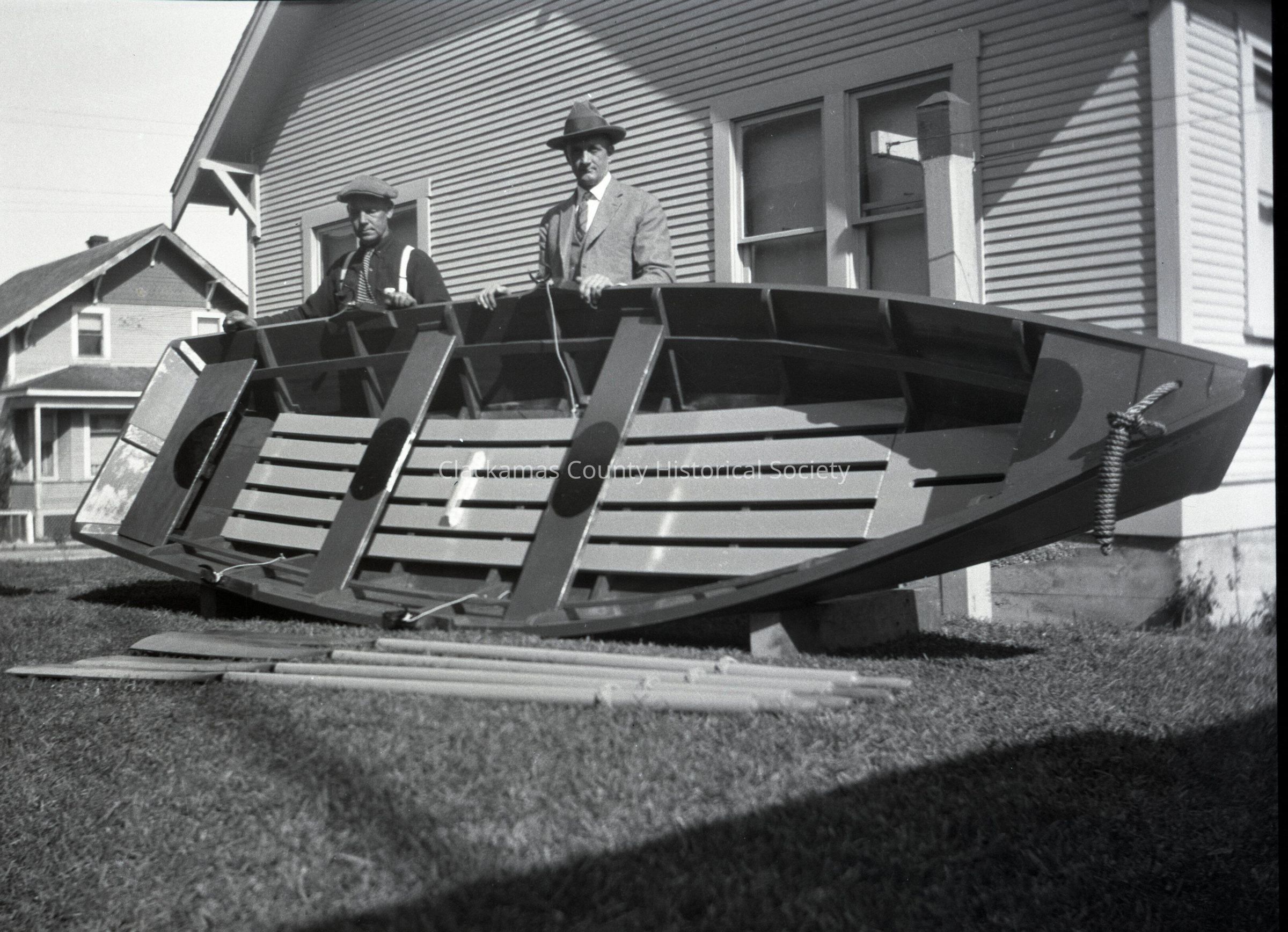 William Krueger and H.C. Frisbie with rowboat in yard. Photo #2.Made/Created