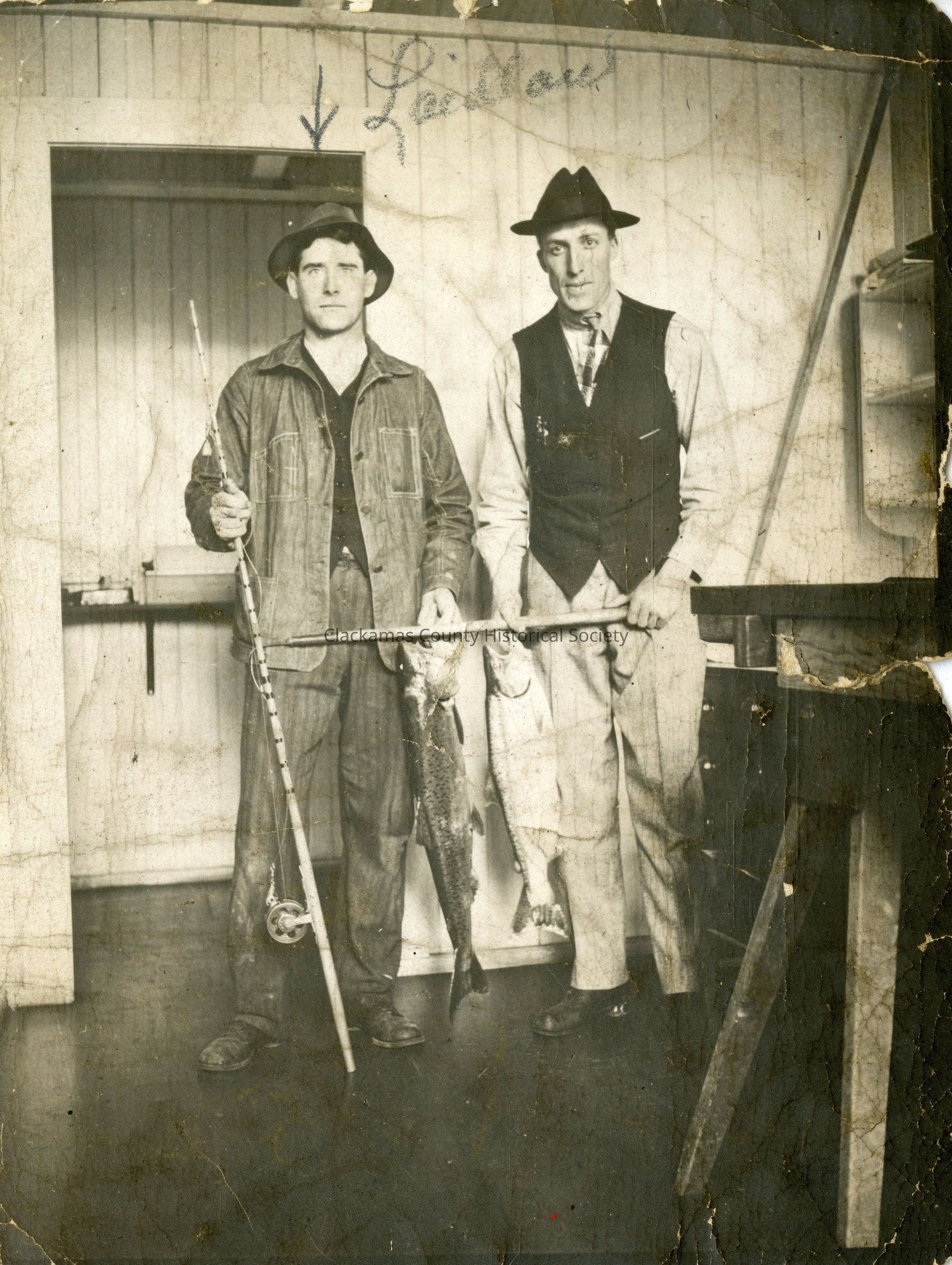 William Laidlaw & friend with fish in Oregon City, 1914. The friend name looks like Clarence Aldridge, but likely Clarence Alldredge. Laidlaw on left in photo.Made/Created